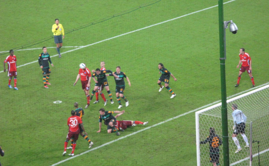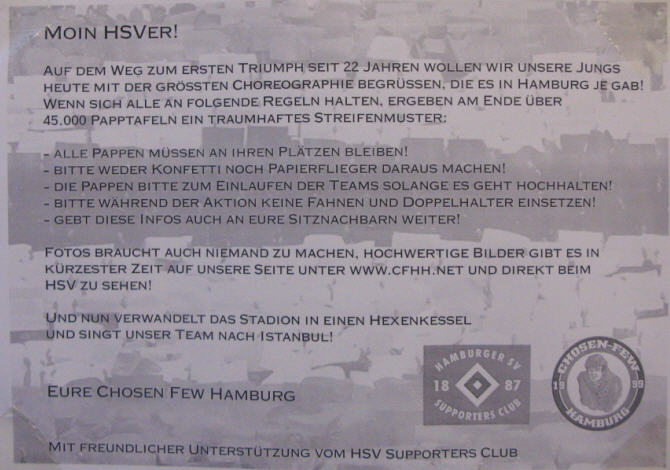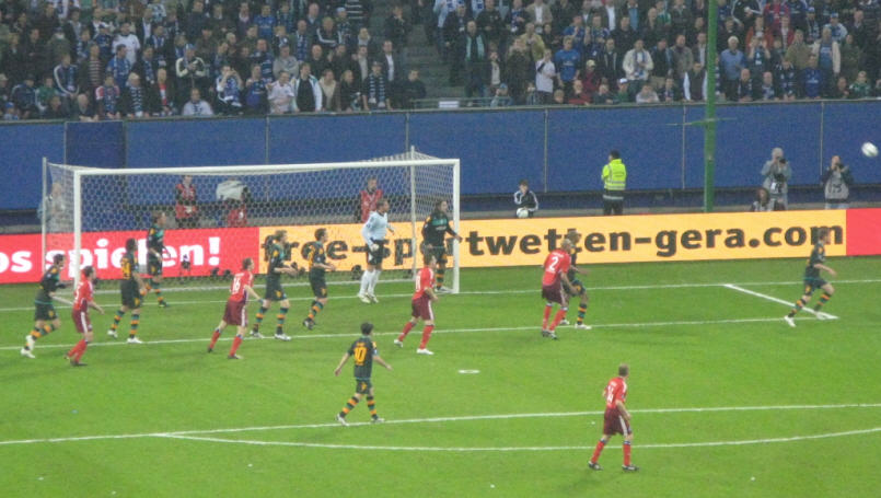 Nach früher Führung plätscherte das Spiel lange vor sich hin, bevor Werder mit einem offensichtlichem Doppelpass unsere Abwehr aushebelte. Und des weiteren gab es dann die Tore 2 und 3 für Werder, die in meinen Augen höchst unglücklich gefallen sind. Diese ominöse Papierkugel hat wohl einiges dazu beigetragen. Aber unser Hsv hatte sich längst noch nicht aufgegeben und gab noch einmal alles, was auch im Stadion zu spüren war. Es brodelte und kochte während der gesamten 90 Minuten. Meiner Meinung nach wurde uns dazu auch noch ein klarer Elfmeter verwehrt. Diese Niederlage und das damit verbundene Ausscheiden war höchst unglücklich und man hätte dieses Spiel für uns entscheiden können, wenn nicht sogar müssen. |