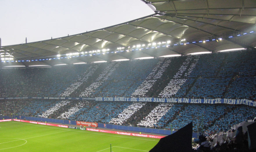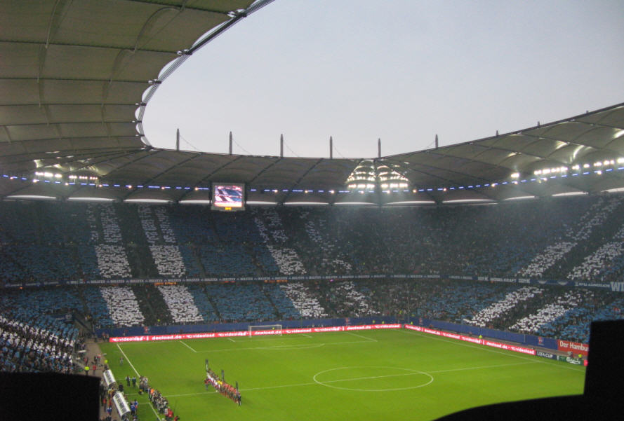 Wir machten uns auf den Weg zum rappelvollem Stadion. Auf den Plätzen angekommen, bekamen wir schon einmal einen Vorgeschmack auf das, was während des Spiels an Gesängen ohrenbetäubenden Lärm verursacht hat. Auf Seiten unseres Hsv gab es eine grandiose Choreo mit Pappen im gesamten Stadion. |