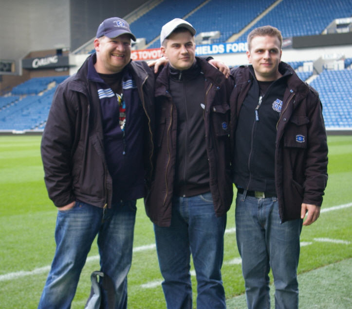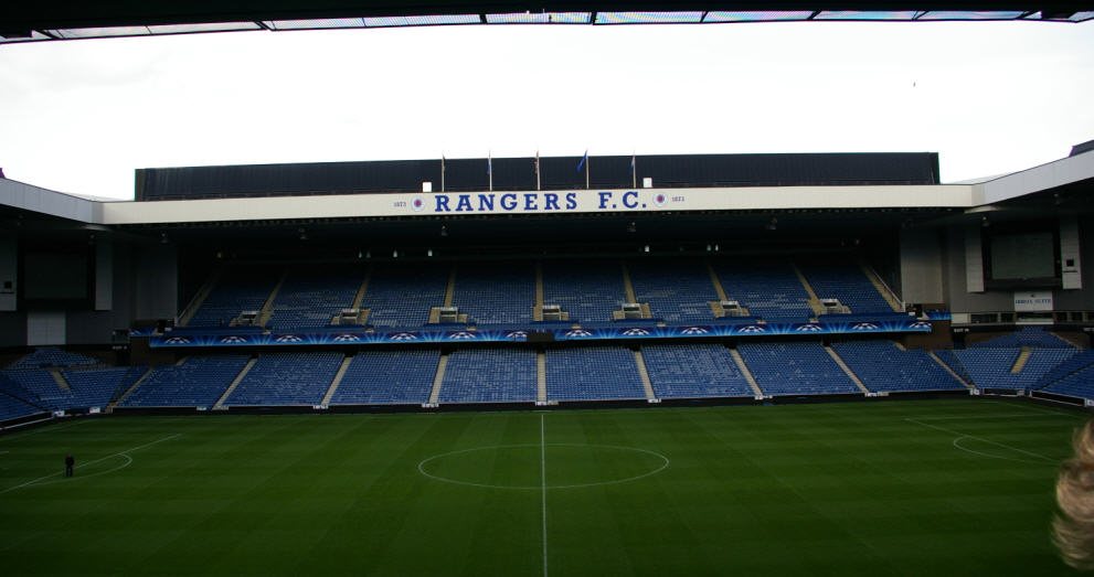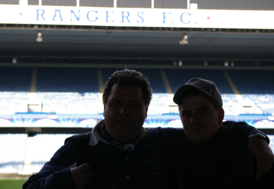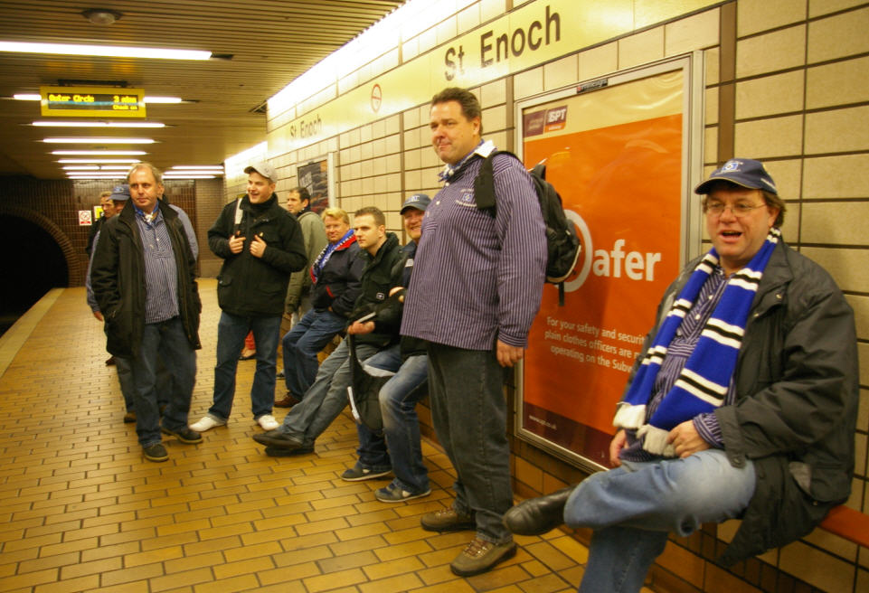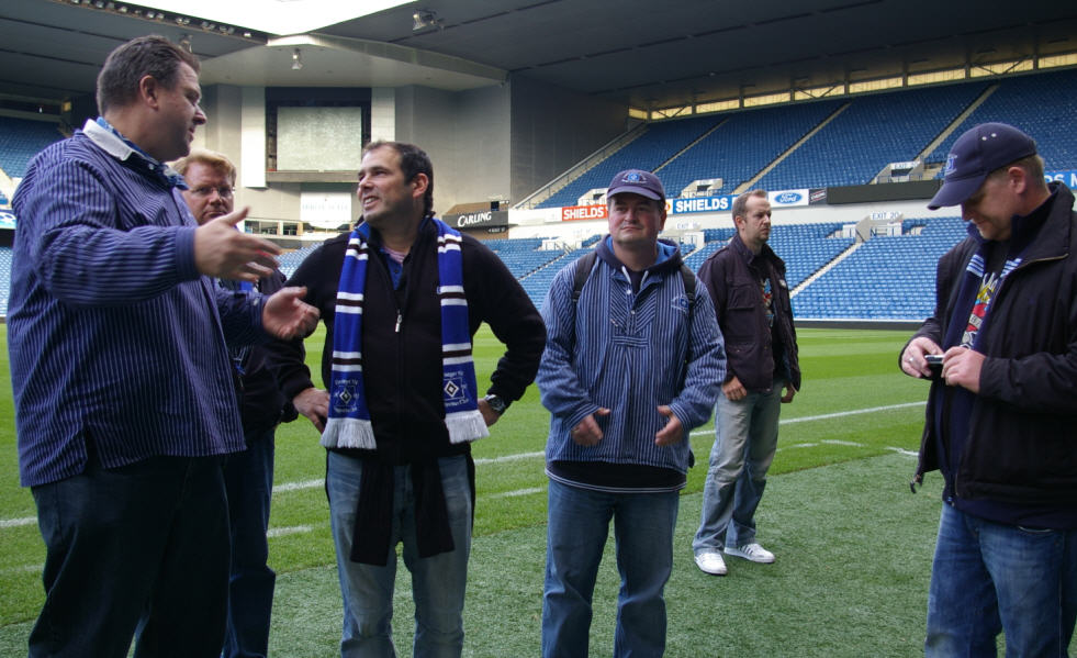 In Glasgow starten wir mit kleinen Hindernissen, der 1.Bus ist voll besetzt und offenbart einen platten Reifen, beim 3. Bus verabschiedet sich in Anbetracht der Hanseaten der Fahrer lieber in Feierabend, hm, so schlimm sind wir doch nicht?!? Irgendwann kommen wir doch noch in der Stadt an und nach diversen Schwierigkeiten am Geldautomaten (nix international), sind alle mit britischen Pfund versorgt und auf geht mit einer niedlichen U-Bahn (selbst ich kann nur in der Mitte gerade stehen) zum Rangers Stadion.