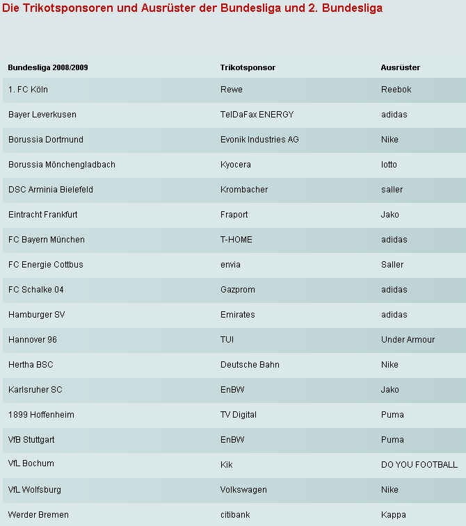 Sponsoring - Trikotwerbung, Bandenwerbung, Stadionname, Ausrüsterverträge… Trikotsponsor: Die Verträge der Trikotsponsoren sind stark erfolgsorientiert. Nur wenn der Verein auch gute Leistungen erzielt und Erfolge hat, kann er mit der Höchstsumme rechnen. Bei Bayern München sollen es bis zu 20 Mio Euro im Jahr sein, bei Hertha BSC beispielsweise bis zu 8 Mio Euro im Jahr. Dank Trikotsponsor Emirates Airlines kommen bis 2011 pro Jahr 7,0 Millionen Euro in die Kasse des HSV. Das reicht in der Rangliste für Platz sechs.