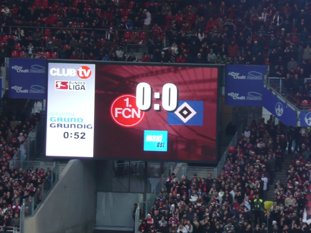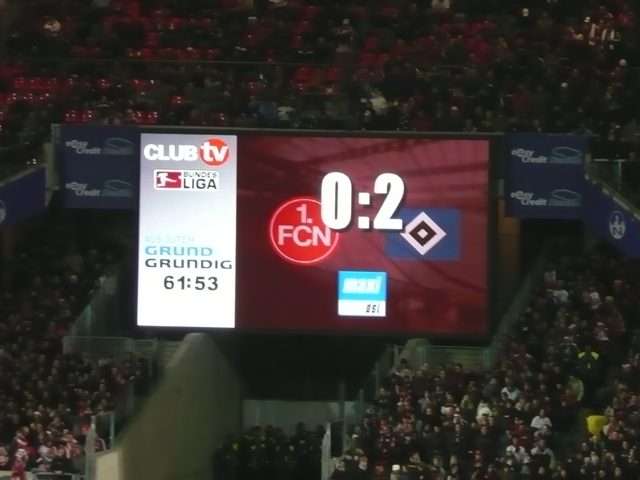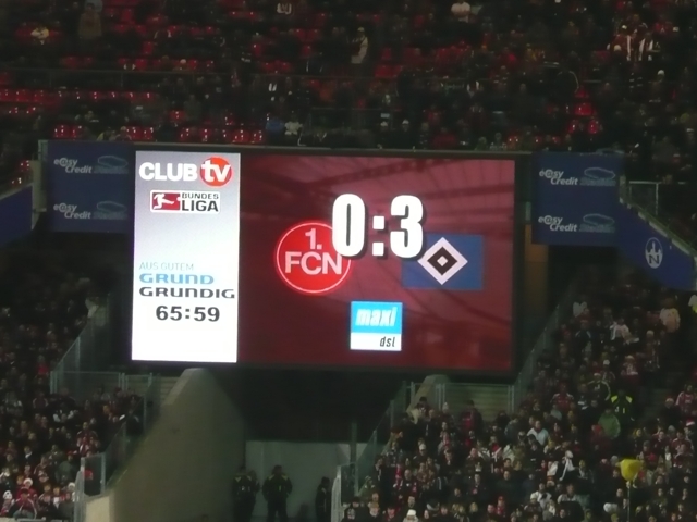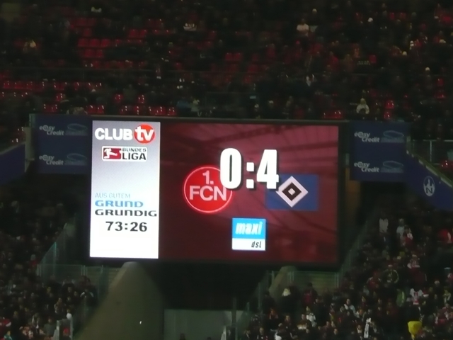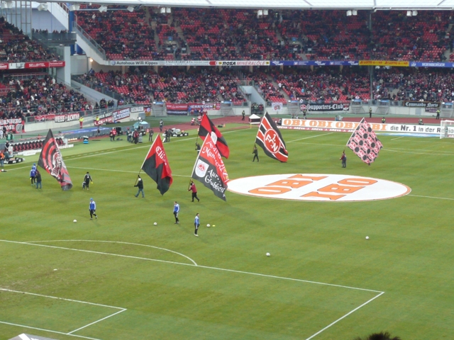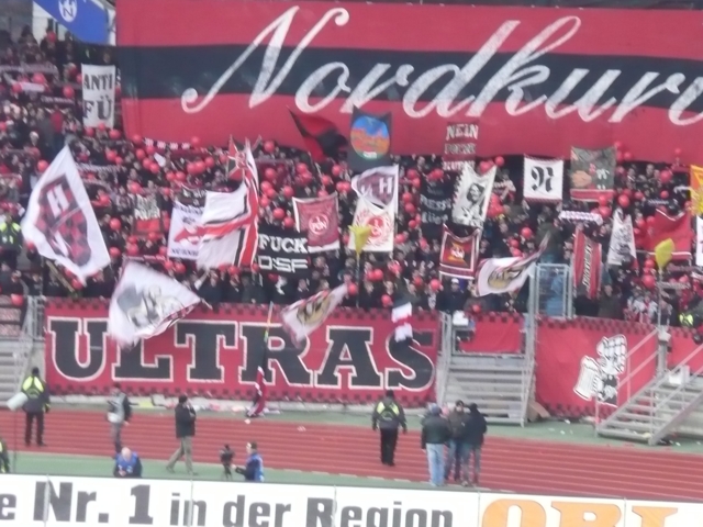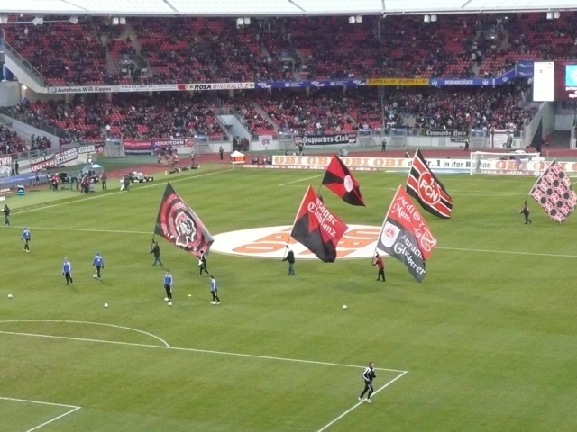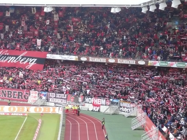 Um kurz vor Zwei machten wir uns langsam auf den Weg zum Easy-Credit-Stadion der Nürnberger - (der Name ist echt schrecklich)-! Die Aufteilung der Bereiche für Gäste und Heimische ist unter aller Kanone. Es gab nur ein Toilettenhäuschen für alle Gästefans, und man konnte nicht zu den Fanshops der Nürnberger gelangen, um Pins etc. zu erwerben. Desweiteren ist zu bemängeln, dass wirklich zu wenig Platz vorhanden war, um auf der Tribüne vernünftig stehen zu können. |