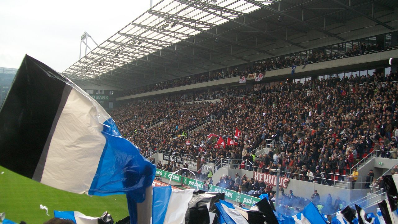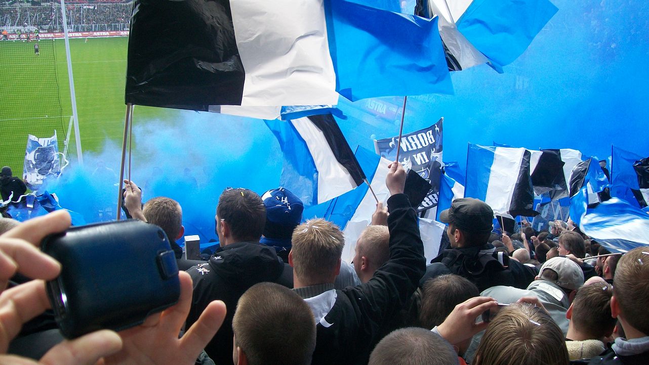 Den Einlauf der Mannschaften verpassten wir weil uns eine Plastiktüte über den Kopf gezogen wurde, und die dann auch noch falsch rum auf dem Kopf. Nach der Plastiktüte dann die blauen Rauchbomben, und irgendwann konnten wir dann das Spiel verfolgen. |