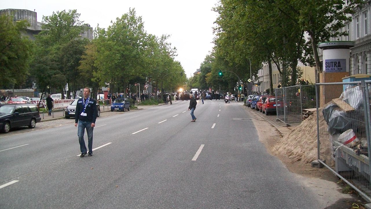 Nach dem Spiel, dann sozusagen Europapokal Atmosphäre wir wurden 20 Minuten auf dem Gelände vor der U-Bahn Feldstraße festgehalten. Genug Zeit für die FC St. Pauli Fans sich auf der gegen über liegen den Straßenseite aufzubauen. Und schon ging das Generve los, Stinkefinger, dumme Sprüche und Beleidigungen, fliegende Bierbecher mit der Präzision eines Paolo Guerreo wechselten Ihre Besitzer.