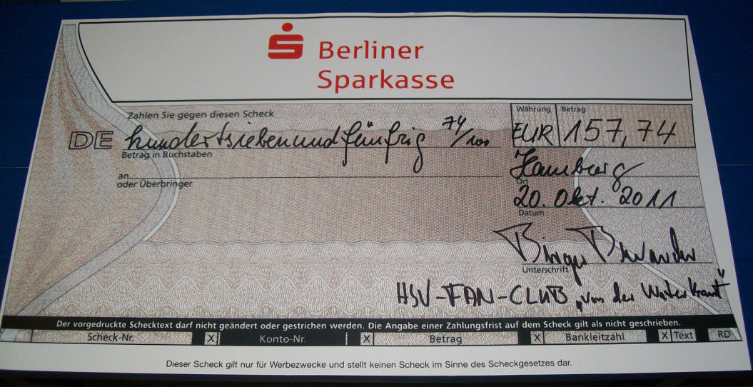 Mit der Übergabe eines Schecks wurde somit der Inhalt des Sparschein unseres HSV-Fan-Clubs „von der Waterkant „ in der Kinderkrebsstation des UKE Eppendorf symbolisch übergeben (Die Überweisung hatte unser Kassenwart bereits Anfang Juli vorgenommen). |
