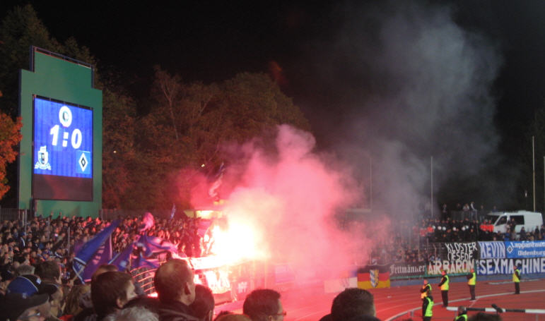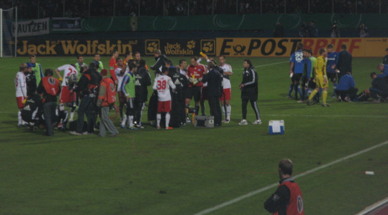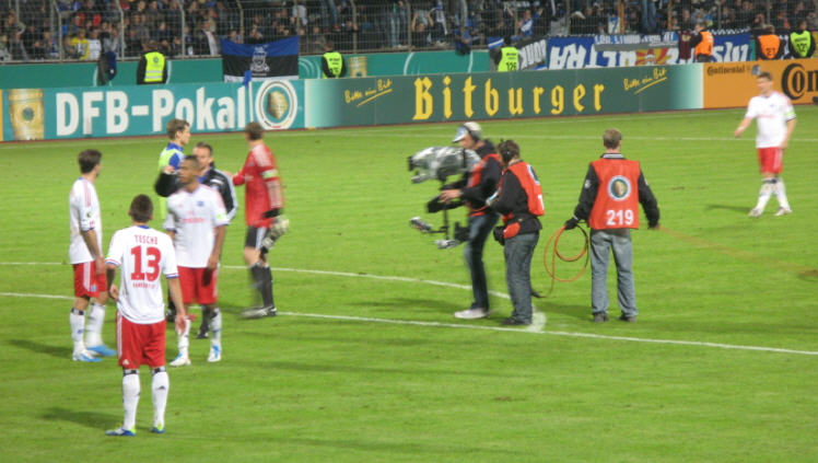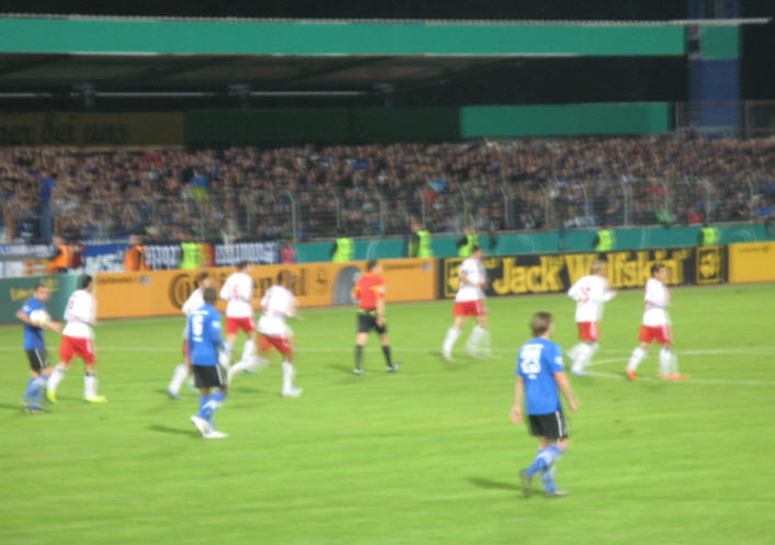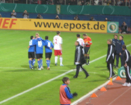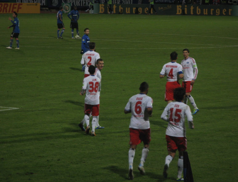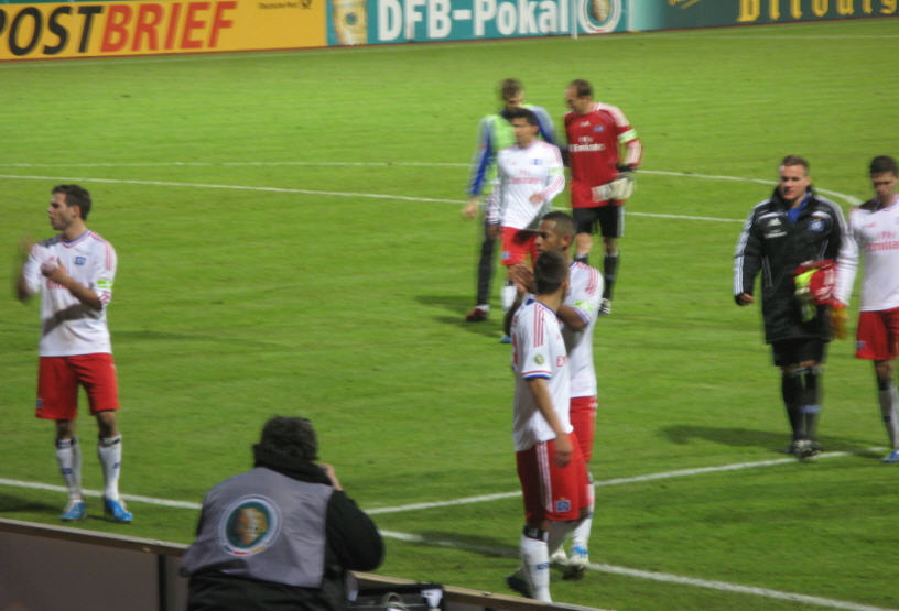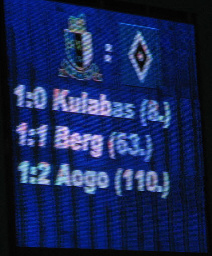 Mit einem herrlichen Freistoß in den Winkel in der zweiten Halbzeit der Verlängerung brachte Aogo den HSV auf die Siegerstraße. damit fielen alle drei Tore auf der Seite der HSV-Fans. |