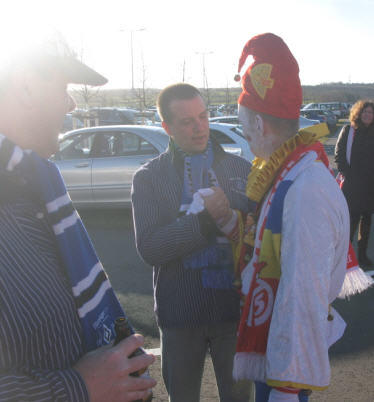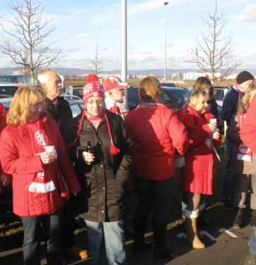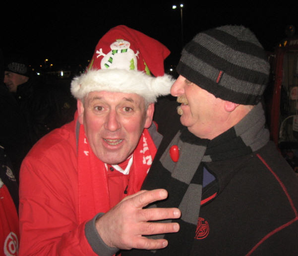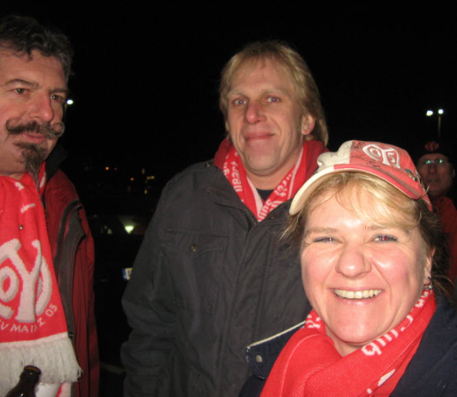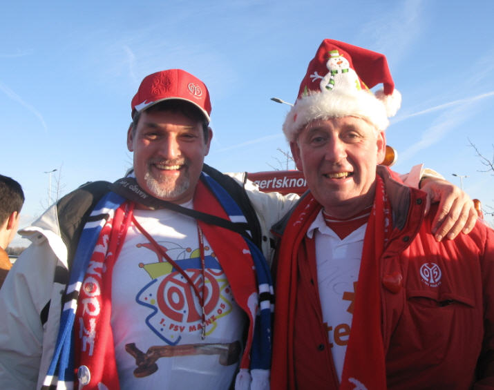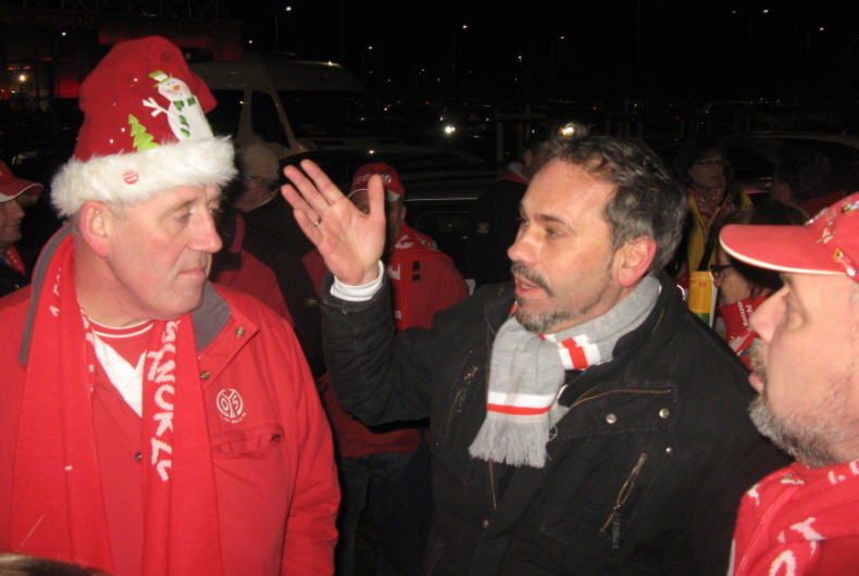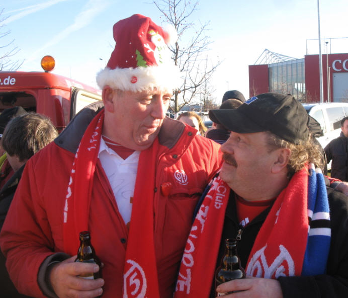 Vier starteten morgens um 06:00 Uhr in Hamburg und entgingen damit knapp dem kurz danach einbrechenden Schneechaos über der Hansestadt. Regi aus Bielefeld, Michael aus Berlin und Dirk aus Bonn kamen mit dem Zug in die rheinlandpfälzsiche Hauptstadt. Meine Wenigkeit war schon einen Tag zuvor bei unseren Mainzer Freunden eingefallen, um mich auf dem berühmten und sehr traditionellen Harxheimer Weihnachtsmarkt auf das anstehende Fussballwochenende einzustimmen.. | |