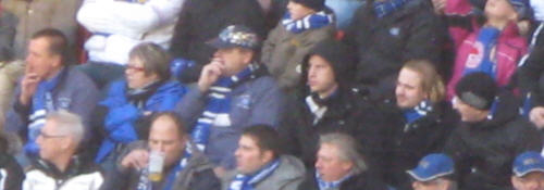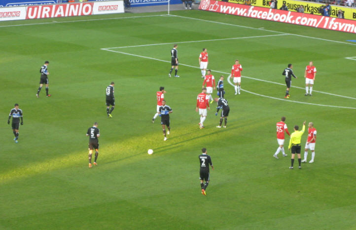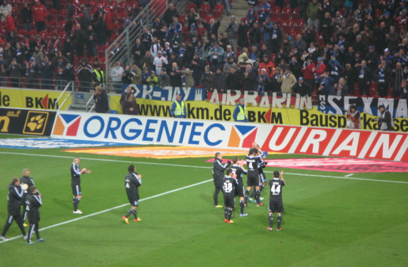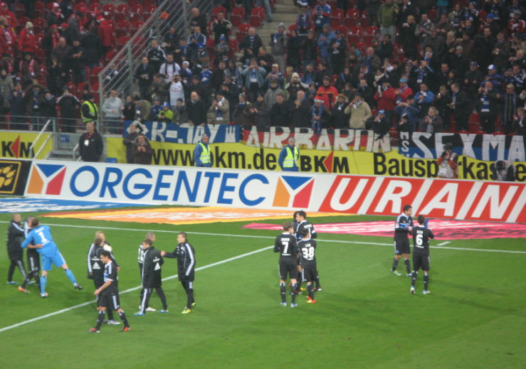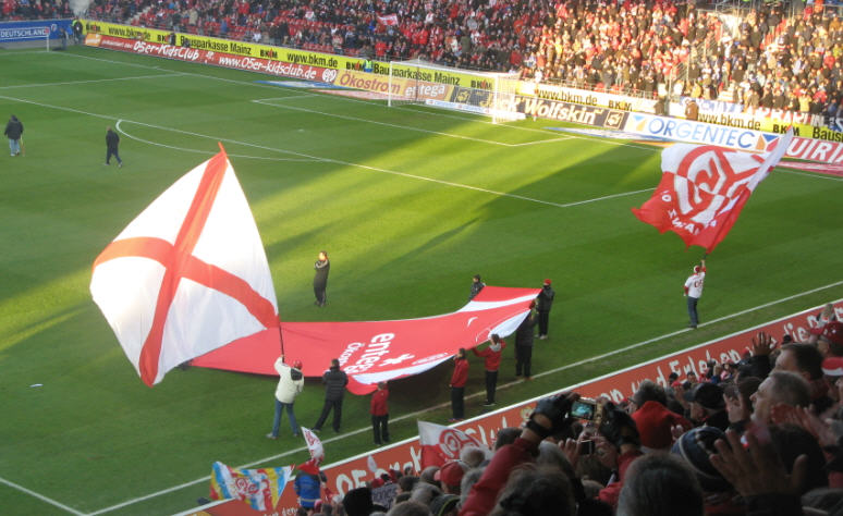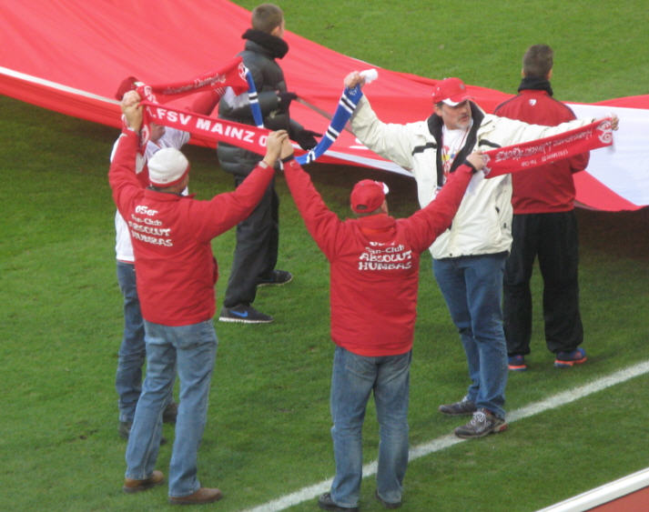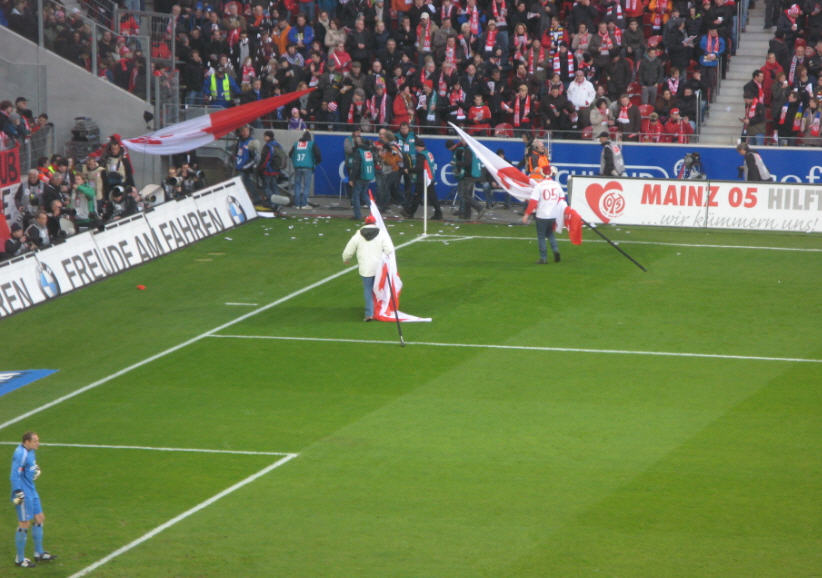 Da unser Frank sich leider das Knie verdreht hatte, durfte ich ihn heute im Innenraum vertreten und hatte die große Ehre - auch unter den kritischen Augen der Waterkantler - beim Einlauf der Mannschaften eine der Mainz 05 - Fahnen zu schwenken. |