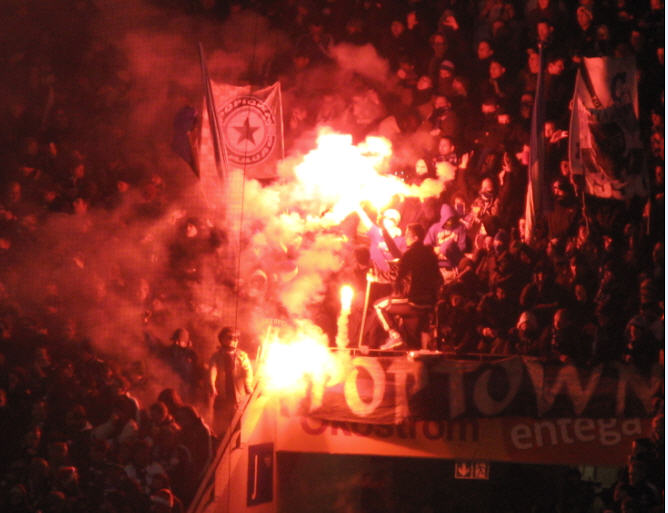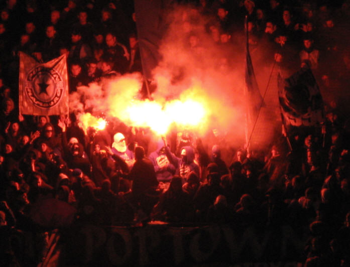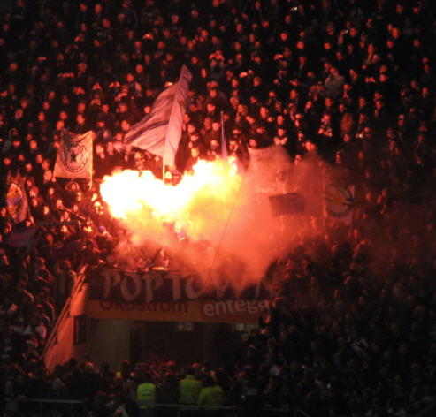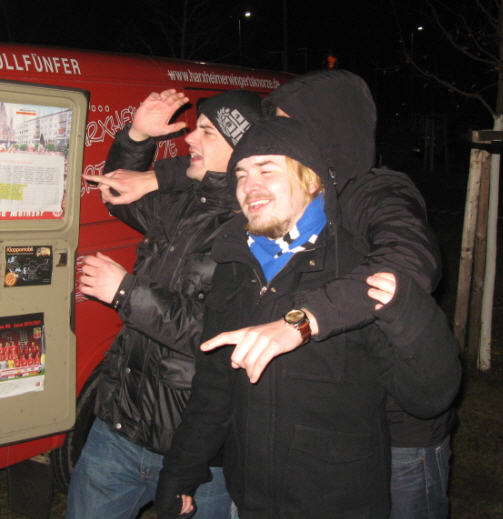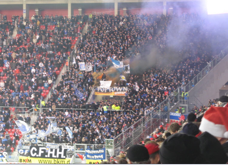 Nein, es war kein Nebel aufgezogen. Einige HSV-Fans fingen wieder mit dem Schwachsinn an. In Italien soll in manchen Stadien beim unkontrollierten Abbrennen mit Wasserwerfern reagiert werden. Das wäre bei einer Außentemperatur von knapp über 0 °C heute wohl auch eine nette Maßnahme gewesen, um die mitgereisten Chaoten abzukühlen. | |