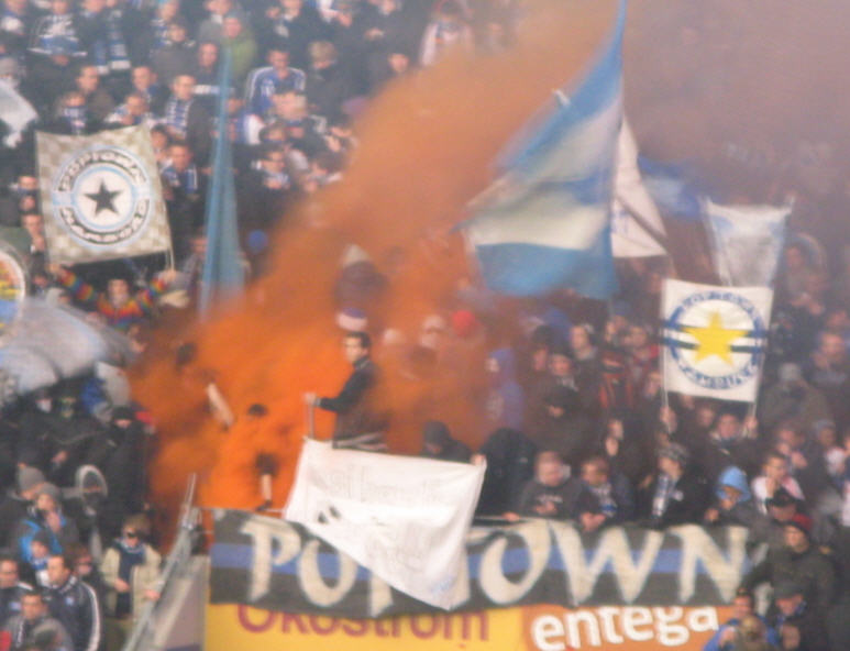 Die Rauchbomben stänken extrem widerlich- selbst bei uns auf der Gegengeraden war der beißende Geruch noch störend. Wirklich ein tolle Aktion von einigen Chaoten. Der Stadionsprecher reagierte darauf mit einem wirklich guten Spruch: "Bei meinem letzten Besuch in Hamburg habe ich festgestellt, dass ihr auch schon Handy benutzt. Da müsst ihr keine Rauchzeichen geben, um euren bekannten mitzuteilen, dass es noch 0:0 steht. Bitte sofort die Rauchbomben ausmachen!" | |
