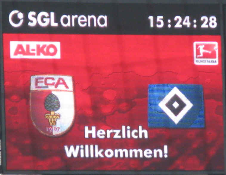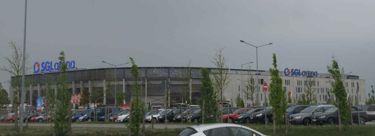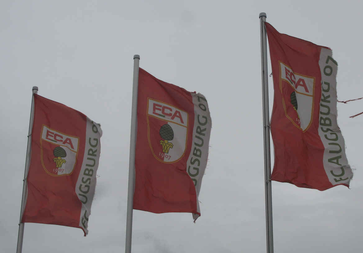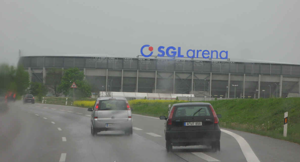 Gegen 10 Uhr machten wir uns dann auf die Fahrt nach Augsburg. Leider hatte es sich das Wetter anders überlegt, so dass der Regen unser Begleiter bis zum Stadion blieb. Mit einer feinen Pause kamen wir gegen 13 Uhr auf dem Parkplatz für 5 € am Stadion an. Ähnlich wie