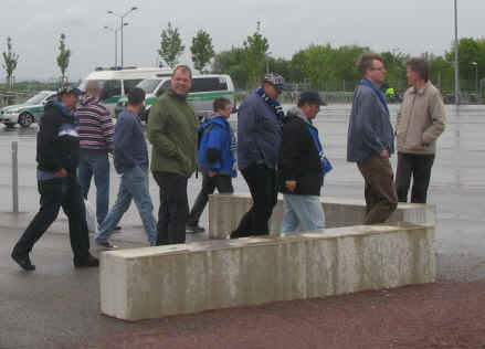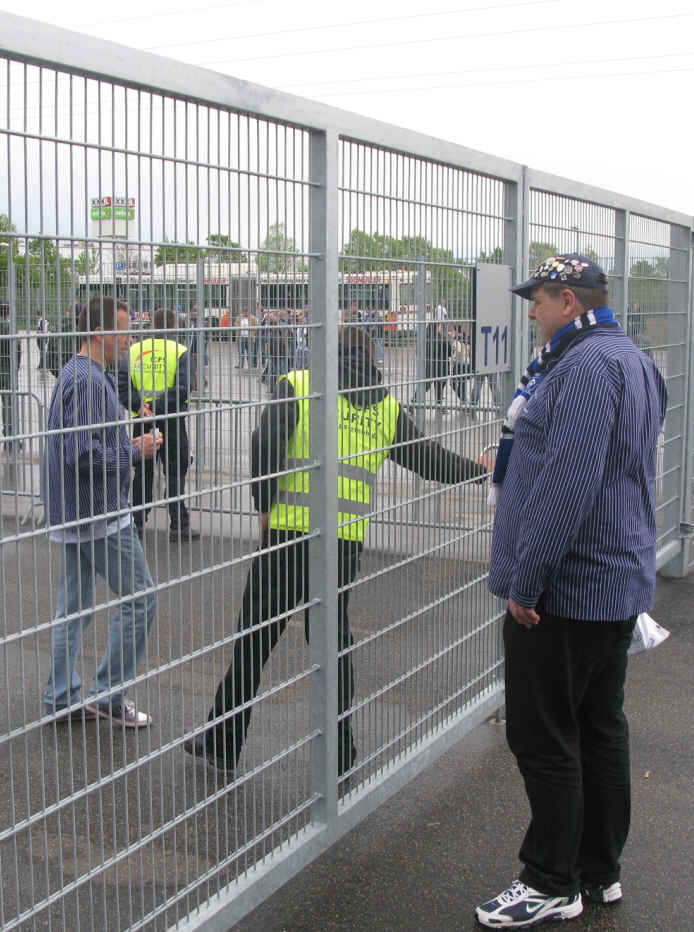 Absperrungen prägen das Bild. Erst einmal muss man ums Stadion (außen)