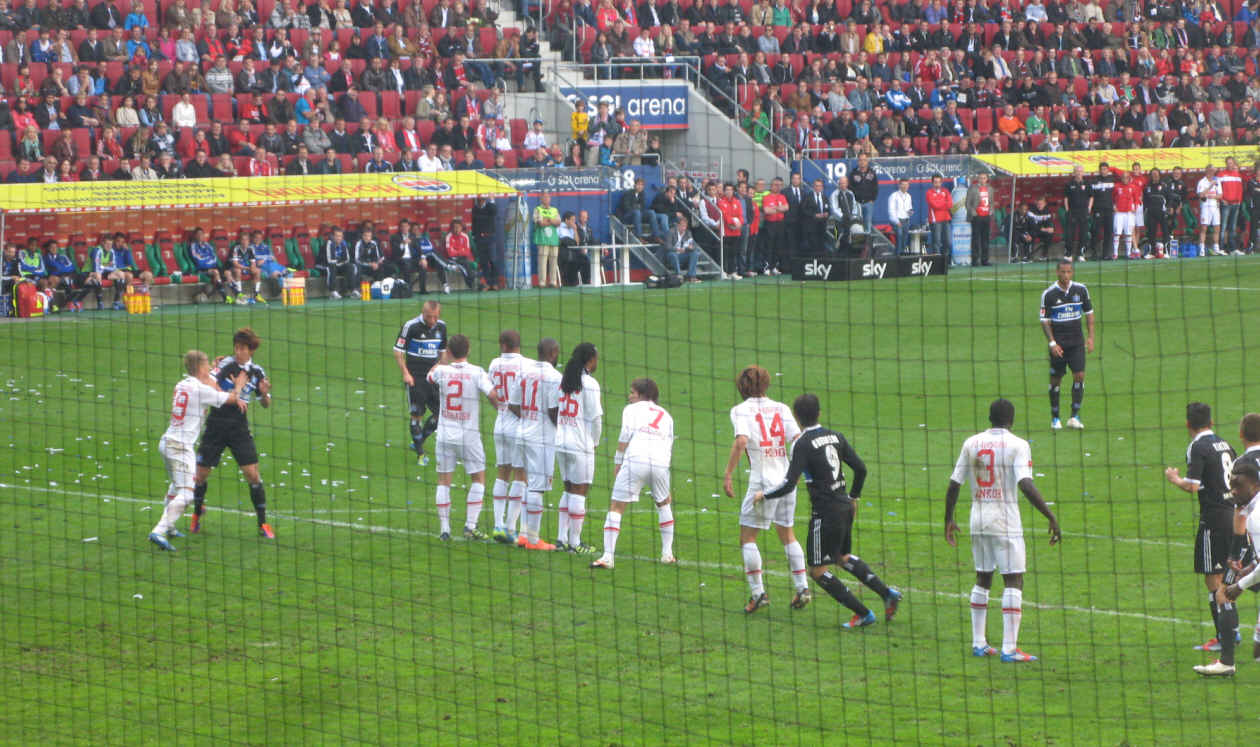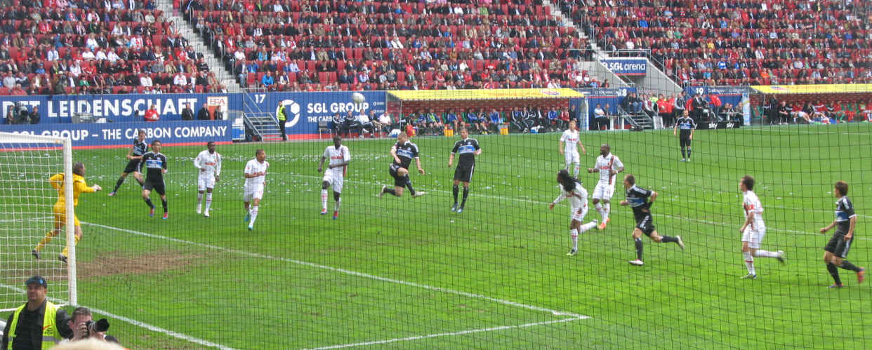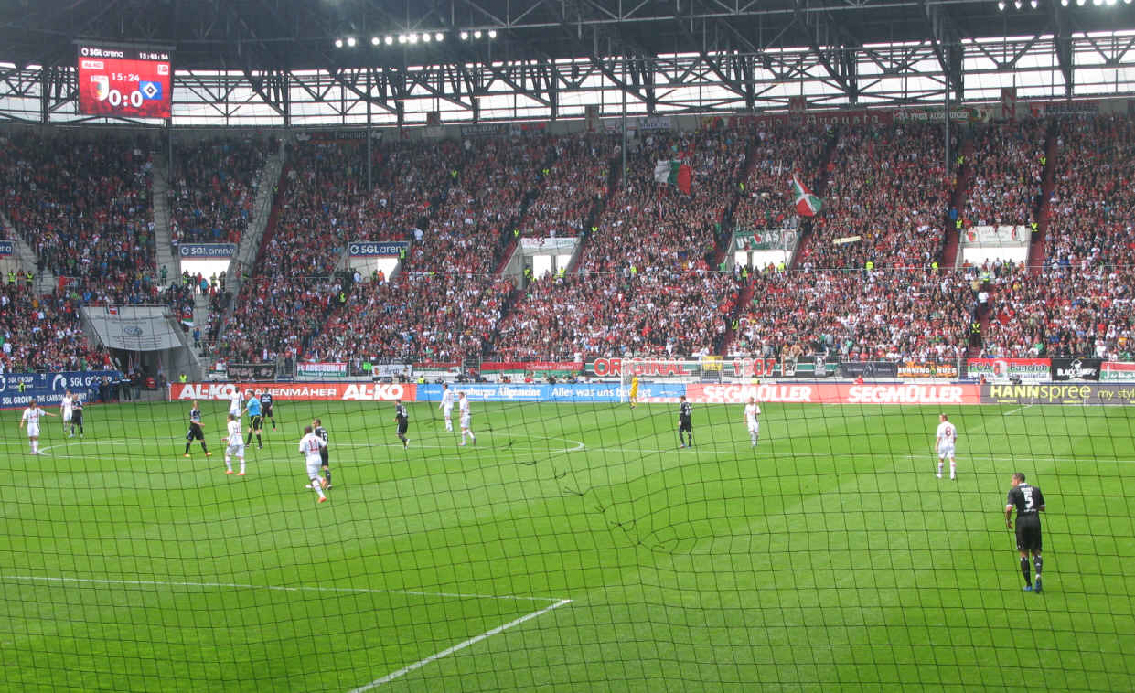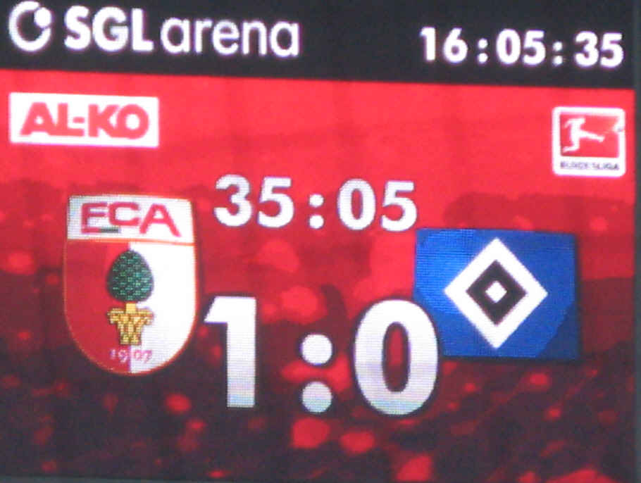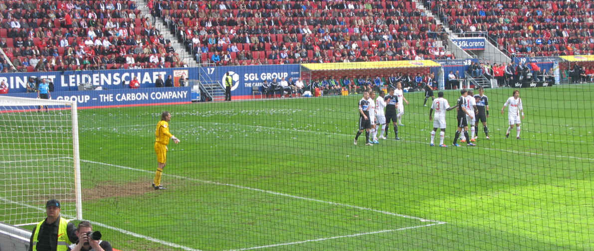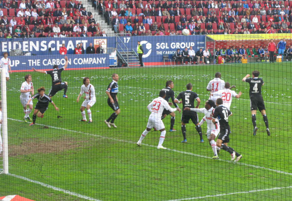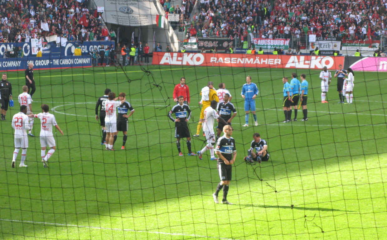 Fast die letzte Aktion des Spiels. Freistoß für die Rothosen. Interessant ist, dass die Augsburger Bank komplett steht und mitzittert, die HSV-Bank aber eher teilnahmslos ist.... | |
