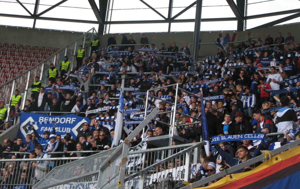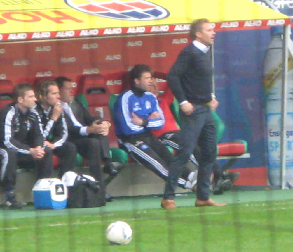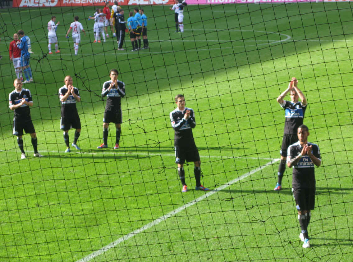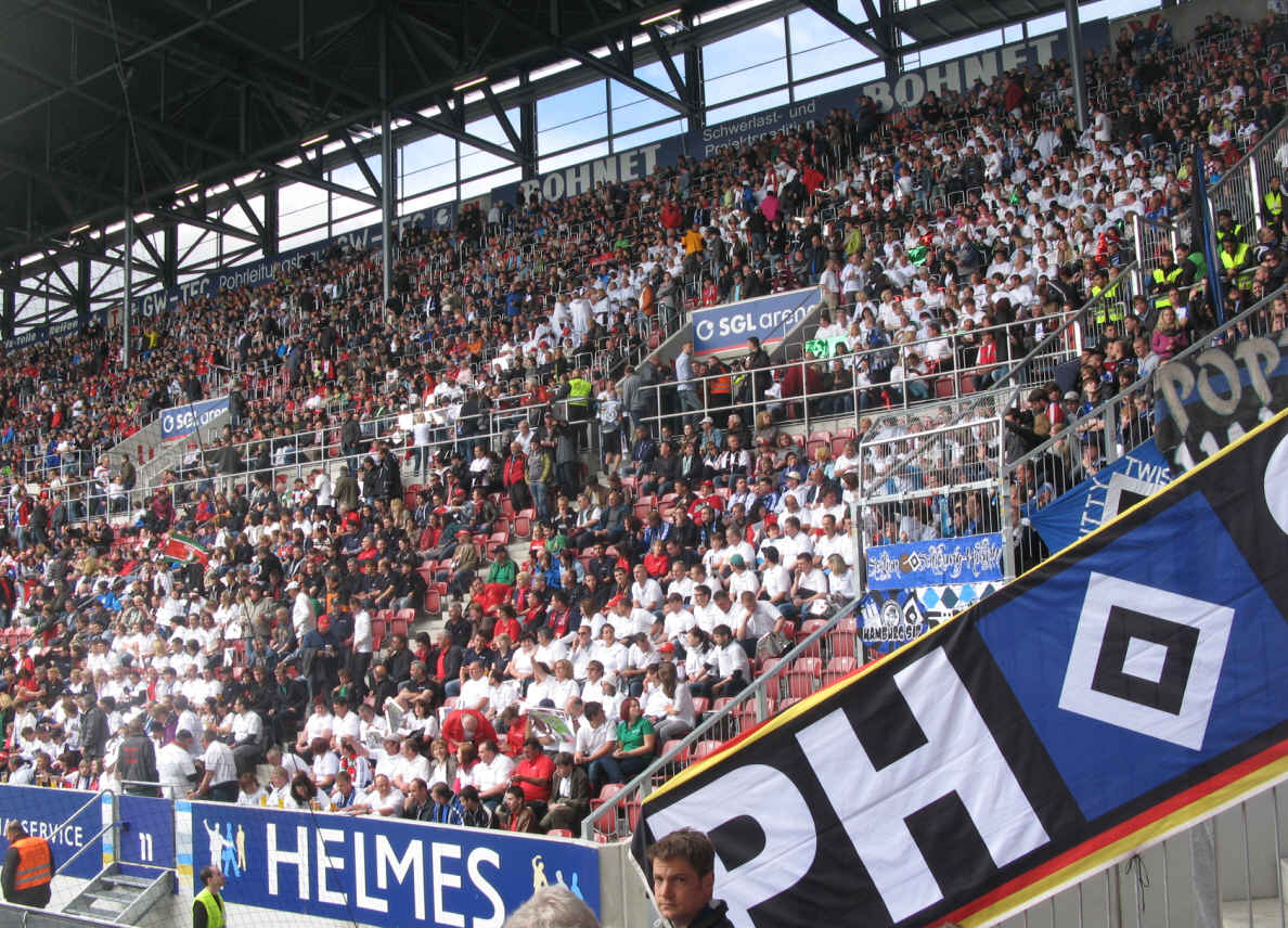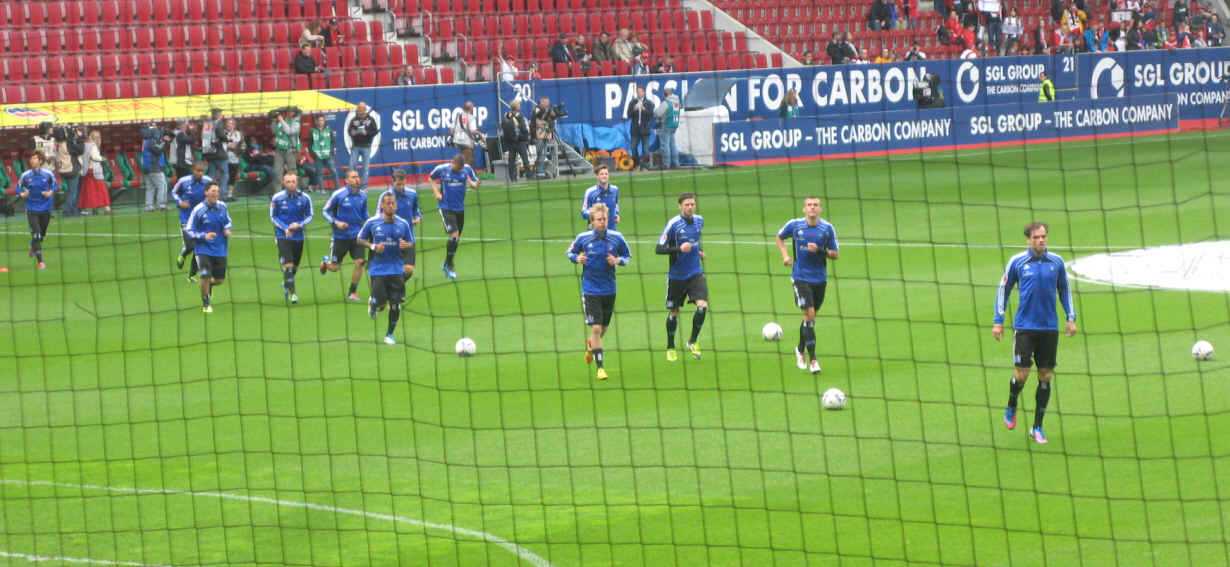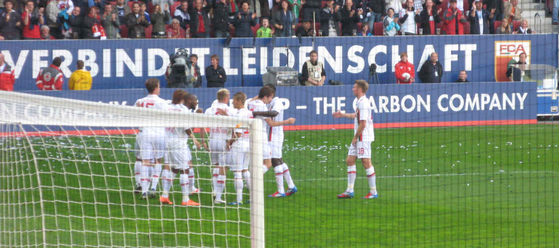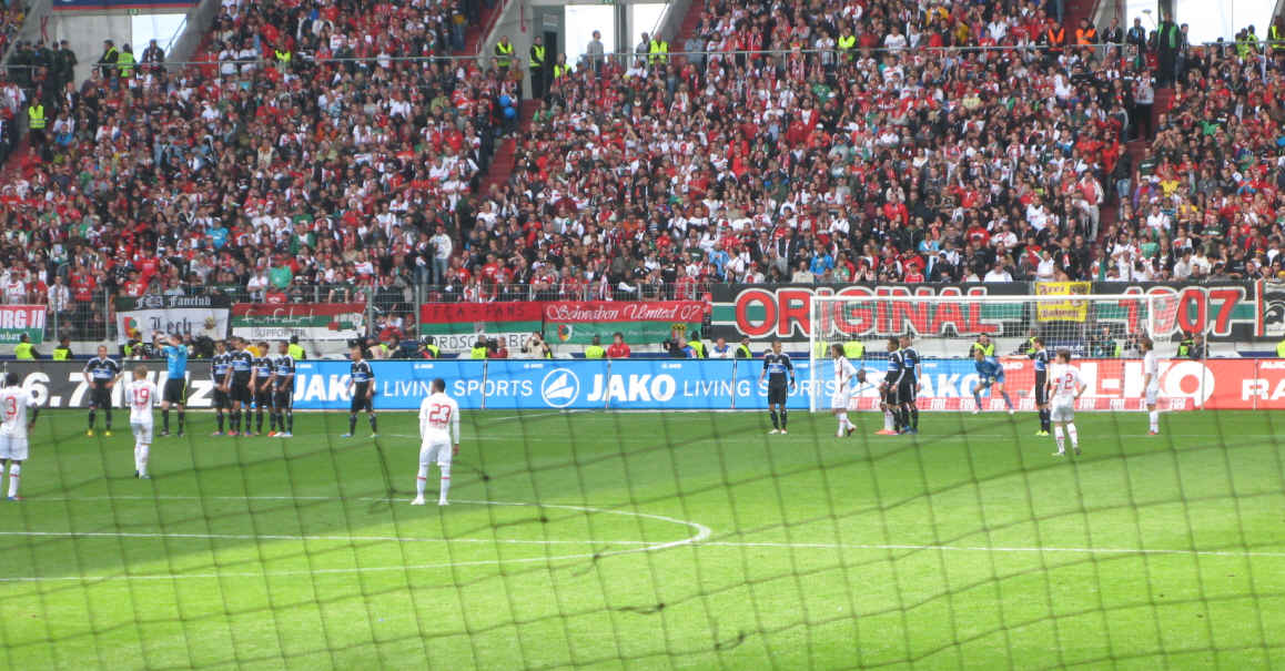 Fast die letzte Aktion des Spiels. Freistoß für die Rothosen. Interessant ist, dass die Augsburger Bank komplett steht und mitzittert, die HSV-Bank aber eher teilnahmslos ist.... | |