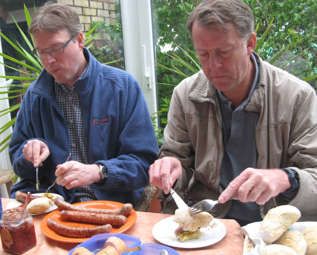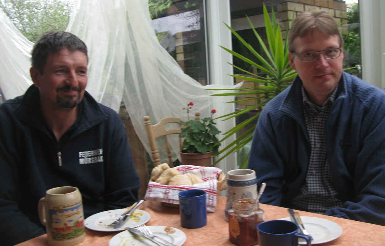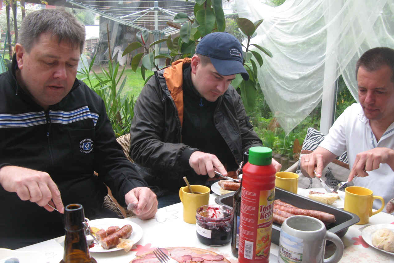 Um 11 Uhr trafen sich alle mit hohen Erwartungen bei Rainer und die Erwartungen wurden mehr als nur erfüllt. Beste Bratwurst, leckere Brötchen, Kaffee, Bier…. Was kann man es sich doch im Wintergarten gut gehen lassen, wenn die Tropfen an die Fenster klopfen. Reichlich gestärkt und mit einem wohligen Gefühl verließen wir Mürsbach gegen 13 Uhr mit dem Versprechen in der neuen Saison (z.B. Fürth) wieder einzukehren!