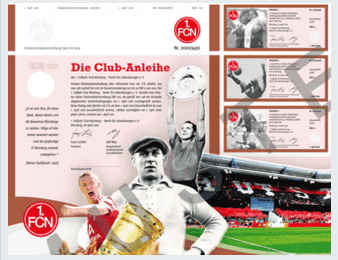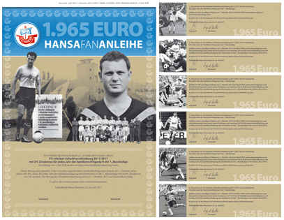 Hertha BSC Berlin Lausig stand es 2010 um die Finanzen des Hauptstadtvereins: Rund 35 Mio. Euro Schulden belasteten die Kasse. Nachdem der Traditionsverein bereits 2004 durch eine Anleihe mit variablem Zinssatz und sechsjähriger Laufzeit 6 Mio. Euro einsammeln konnte, sollte der neue Fan-Bonds ähnlich viel Geld einbringen. Doch nur 3,5 Mio. Euro konnten die Berliner mit ihrer Anleihe einnehmen. Und ein Großteil des Gesamtvolumens stammt nicht von den Fans: Vereinspräsidenten Werner Gegenbauer soll für eine siebenstellige Summe Anteile gezeichnet haben. Die Anleihe ist in drei verschiedenen, aufwendig gestalteten Stückelungen zu 100 Euro, 500 Euro und 1892 Euro - in Anlehnung an unser Gründungsjahr - erhältlich. So sind auf der 100 Euro-Anleihe die aktuellen Nachwuchsfußballer des Vereins abgebildet, auf der 500 Euro-Anleihe befinden sich Bilder ausgewählter Spieler aus dem Lizenzspielerkader 2010/11 und auf der 1892 Euro-Anleihe sind besondere Momente der Vereinsgeschichte. |