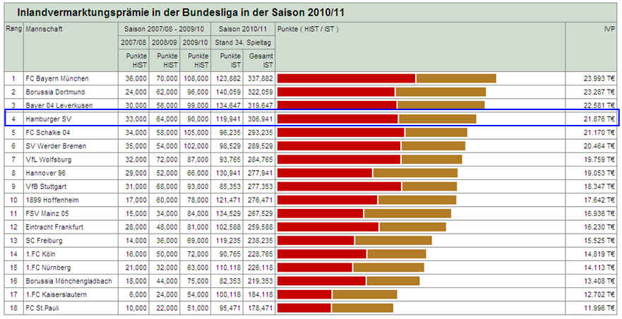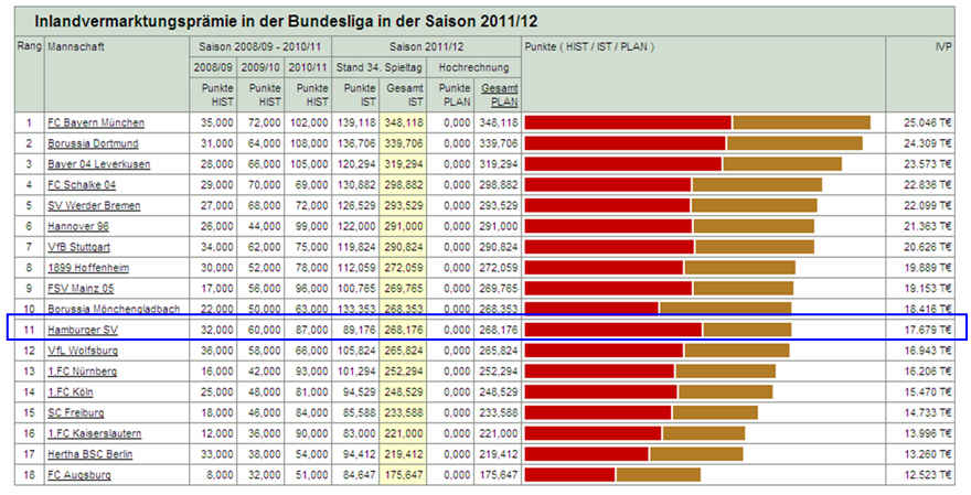 )aufbereitet hat. Der HSV verzeichnet durch die schlechten Leistungen in der abgelaufenen Saison dadurch eine Reduzierung seines Anteils an den Fernsehgeldern von 21,9 Mio € in der Saison 2010/2011 auf nur noch 17,7 Mio € in der Saison 2011/2012.