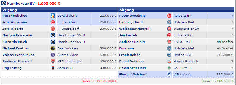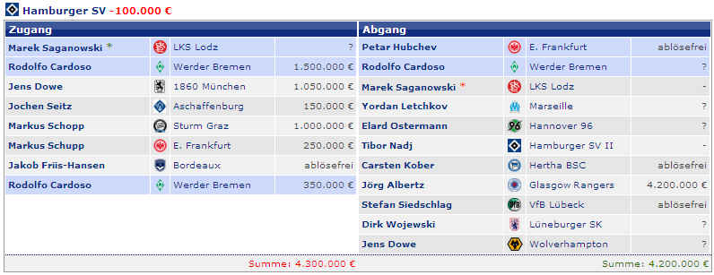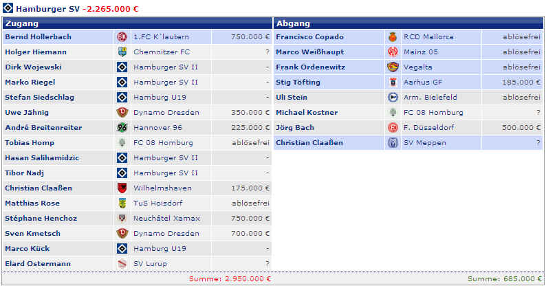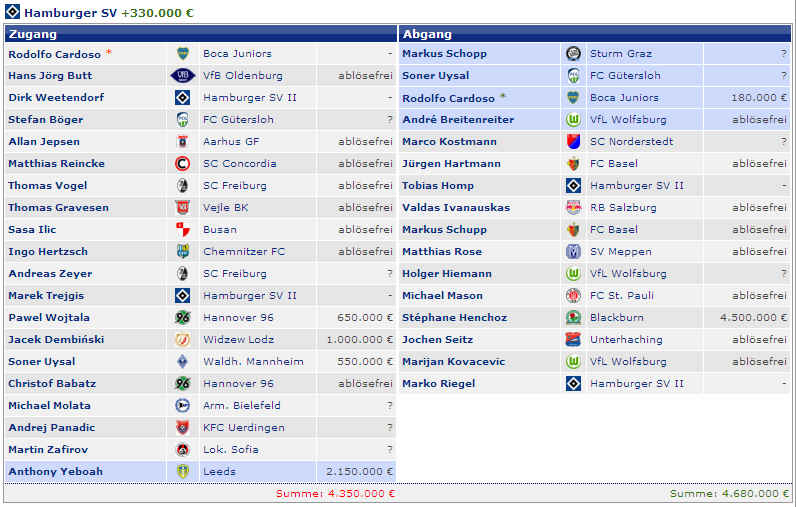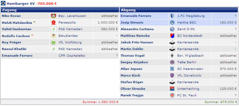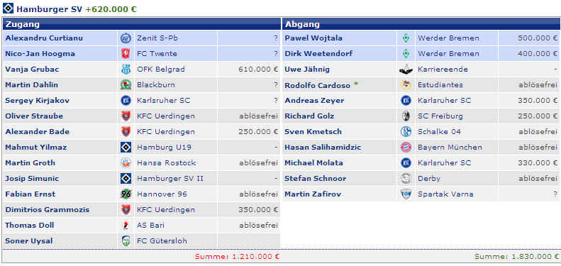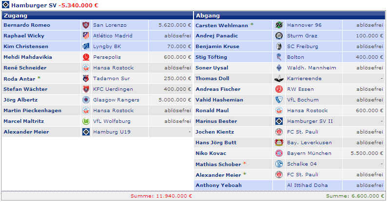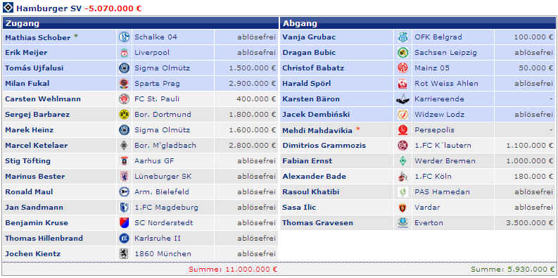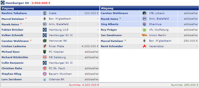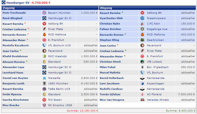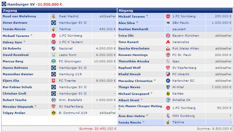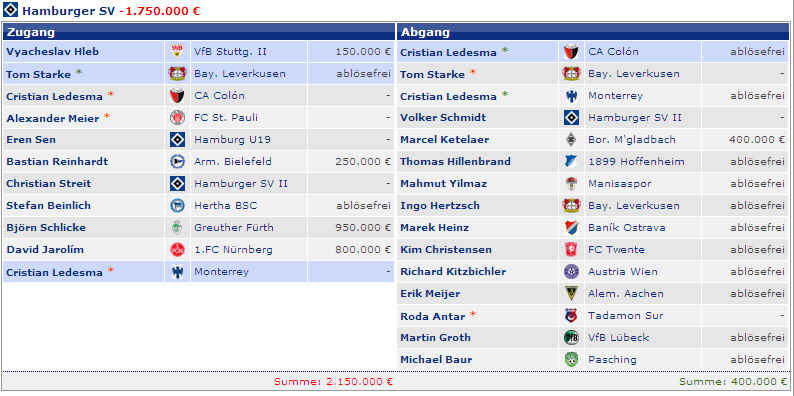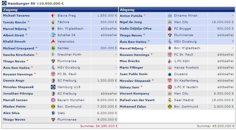 Dagegen stehen die vier Spieler (M.Petric, D.Rozehnal, J.Albertz und B.Romeo) in den letzten Jahren mit – 22,42 Mio €. Hierbei fällt natürlich zu Buche, wenn Spieler ablösefrei den verein verlassen. Und wer jetzt noch weitere Detailinformationen haben möchte, hier die einzelnen Jahre in der Übersicht: |
