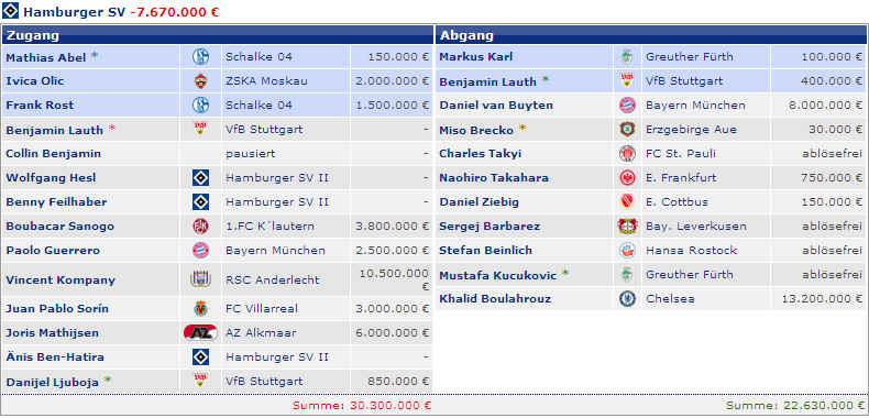 höchsten Transferüberschüssen (N. de Jong, K.Boulahrouz, J.Boateng und R.
