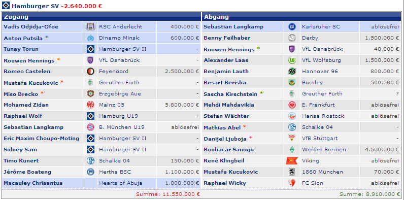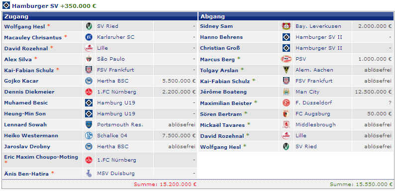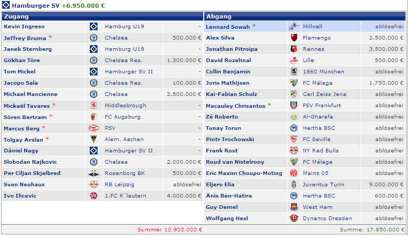 vermerkt. Dazu kommt noch, dass für einige Spieler der HSV nicht mehr die kompletten Transfererlöse erhält, da im Vorwege Rechte gegen Einmalzahlungen abgetreten wurden (siehe auch 2. Sponsorenmodell „Anstoß hoch 3“ Link: Finanzierung des HSV.). Und noch weitere Punkte, die es erschweren die Transfererlöse einzuschätzen. Teilweise wird zwischen den Vereinen eine Ratenzahlung vereinbart. Das bedeutet, dass sich die Transferzahlungen über mehrere Jahre hinweg erstrecken. Ebenso werden immer häufiger in Verträgen Sonderzahlungen vereinbart. So erhielt der HSV für den Pokalsieg Real Madrids im Jahr 2011 280.000 € und für die Meisterschaft Reals 2012 noch einmal 1.000.000 € Sonderzahlungen, die beim damaligen Wechsel Van der Vaart’s vereinbart worden waren, obwohl dieser mittlerweile bei Tottenham seine Fußballschuhe schnürt. Auch soll es für die Meisterschaft 2012 von Juventus Turin noch einmal 1.000.000 € Nachschlag für den Transfer von Elia geben. Es entstehen aber auch noch eventuell Zahlungen an die Vorbesitzer, wenn diese sich Anteile beim Weiterverkauf gesichert haben. Als letzte Anmerkung noch, dass Transferzahlungen für Trainer hier auch nicht berücksichtigt werden. Als Bruno Labbadia der Wunschnachfolger von Jol zum 01.07.2009 werden sollte, überwies der HSV eine höhere sechsstellige Summe an dessen vorherigen Arbeitgeber Bayer 04 Leverkusen. Zunächst einmal eine Übersicht der letzten Jahre in einer Tabelle (alle Zahlen in €): |