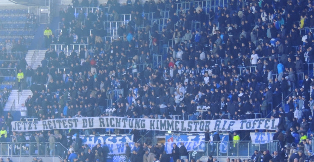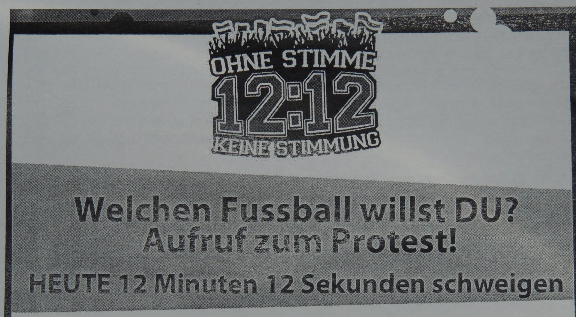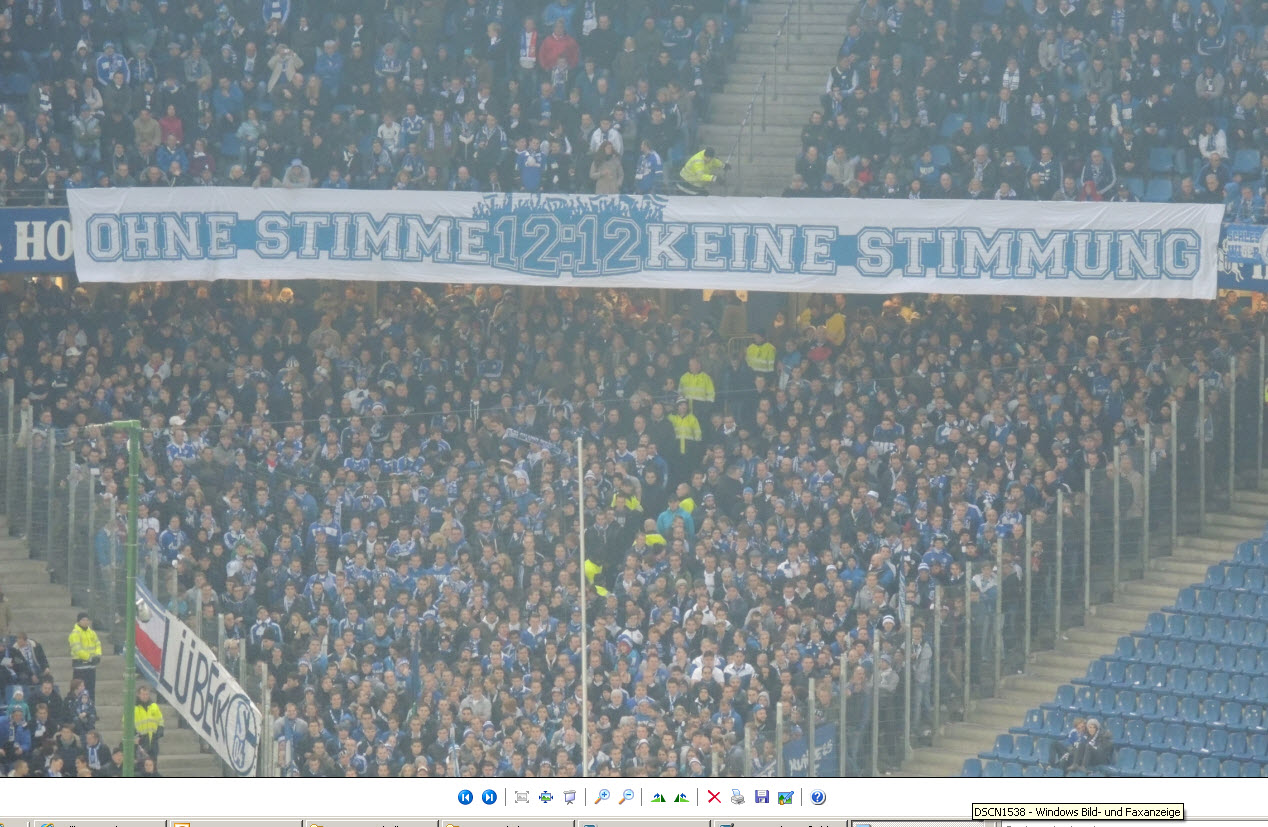 Und noch etwas besonderes - in allen Stadien sollte heute mal keine Stimmung gemacht werden. Zumindest für die ersten 12 Minuten und 12 Sekunden sollte dies so sein. Am 12.12.2013 entscheidet der DFB über das künftige Umgehen mit den Fans. Bis hin zu eventuellen Stehplatzverboten (irrige Ansicht unseres Innenministers - fern ab jeder Fankultur) soll der Umgang mit "Problemfans" beschlossen werden. Die, dies es angeht, nämlich die Fans sind dabei nicht vernünftig beteiligt worden - und deshalb diese Aktion, die auch an den nächsten Spieltagen noch fortgesetzt werden soll. | |
