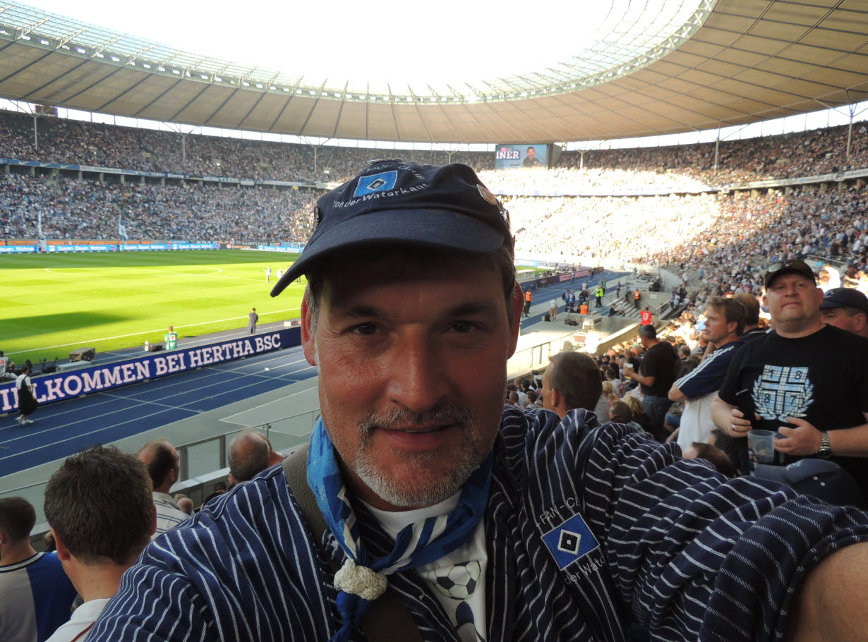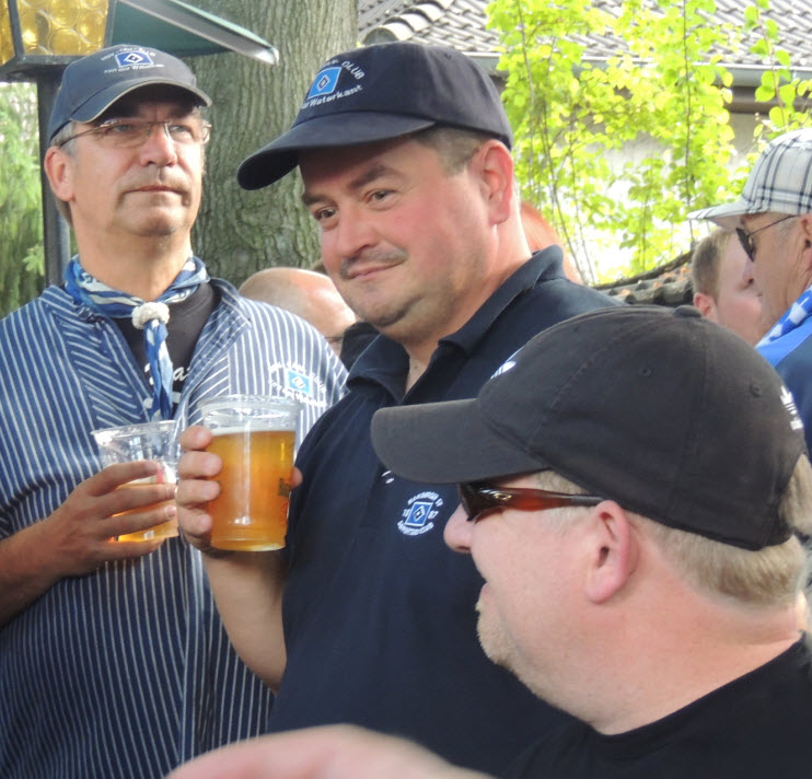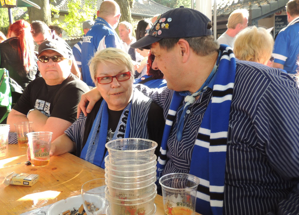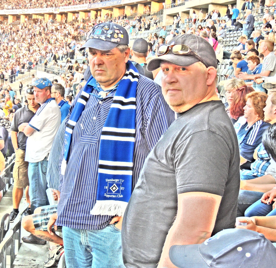 Dann noch eben ein kühles Getränk aus dem unerschöpflichen Vorrat von Birger und ab ins Wirtshaus, wo Zicke und Regina schon auf uns warteten. Dort angekommen, nahmen wir dann 2 kühle Blonde zu uns (den edlen Spendern vielen Dank). Dabei haben wir natürlich nicht vergessen, mit vielen anderen dort anwesenden HSV-Fans, um 16 Uhr 59 Minuten und 50 Sekunden im Biergarten von 10 auf 0 in die 50-jährige ununterbrochene Erstklassigkeit sprich Bundesliga-zugehörigkeit unseres Hamburger SV hinein zu zählen (siehe Facebook). Eine gute halbe Stunde später haben wir uns auf den Weg ins Stadion gemacht. Hier hatte uns Birger richtig gute Plätze besorgt (Unterrang , 14. Reihe , auf Höhe der Strafraumgrenze) . |