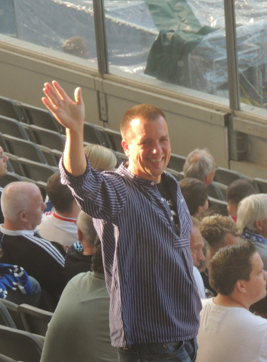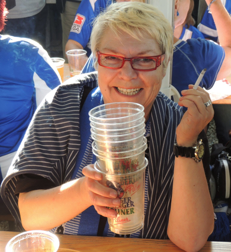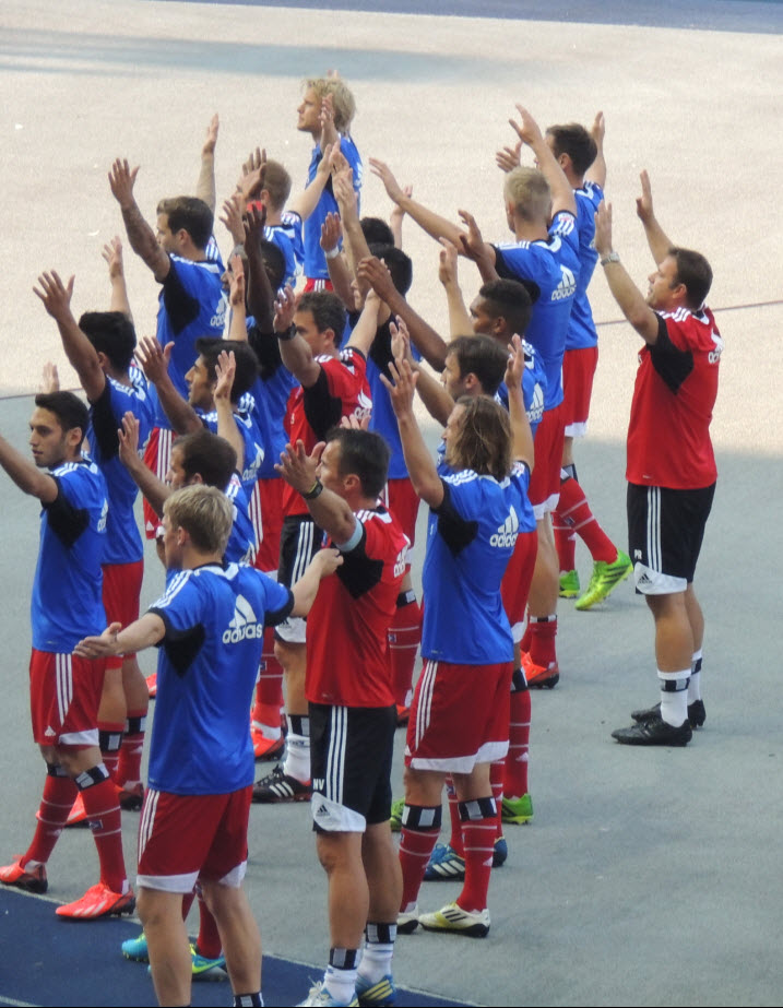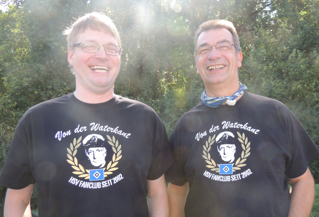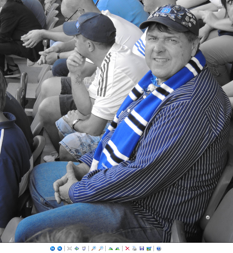 Dann noch eben ein kühles Getränk aus dem unerschöpflichen Vorrat von Birger und ab ins Wirtshaus, wo Zicke und Regina schon auf uns warteten. Dort angekommen, nahmen wir dann 2 kühle Blonde zu uns (den edlen Spendern vielen Dank). Dabei haben wir natürlich nicht vergessen, mit vielen anderen dort anwesenden HSV-Fans, um 16 Uhr 59 Minuten und 50 Sekunden im Biergarten von 10 auf 0 in die 50-jährige ununterbrochene Erstklassigkeit sprich Bundesliga-zugehörigkeit unseres Hamburger SV hinein zu zählen (siehe Facebook). Eine gute halbe Stunde später haben wir uns auf den Weg ins Stadion gemacht. Hier hatte uns Birger richtig gute Plätze besorgt (Unterrang , 14. Reihe , auf Höhe der Strafraumgrenze) . |
