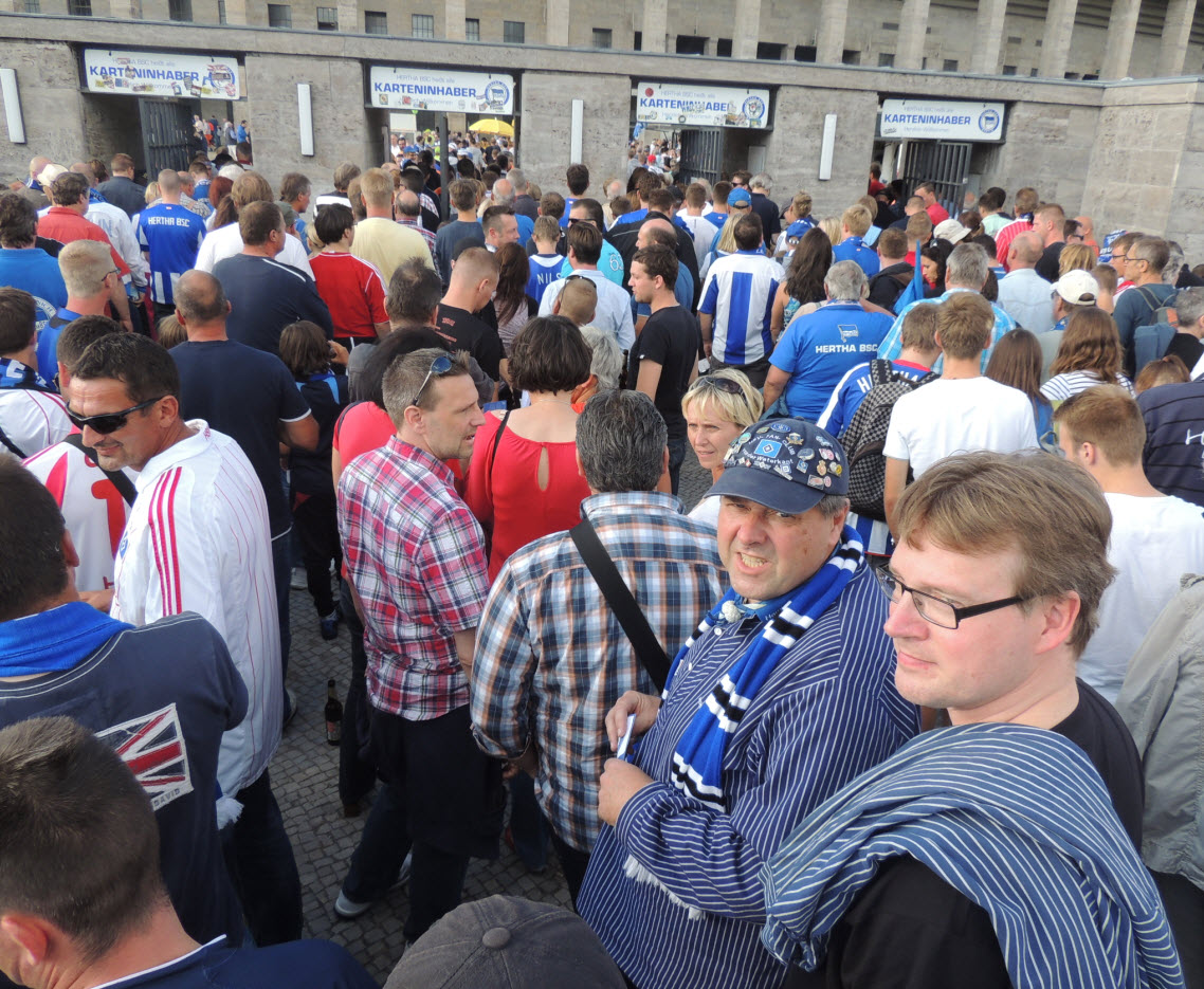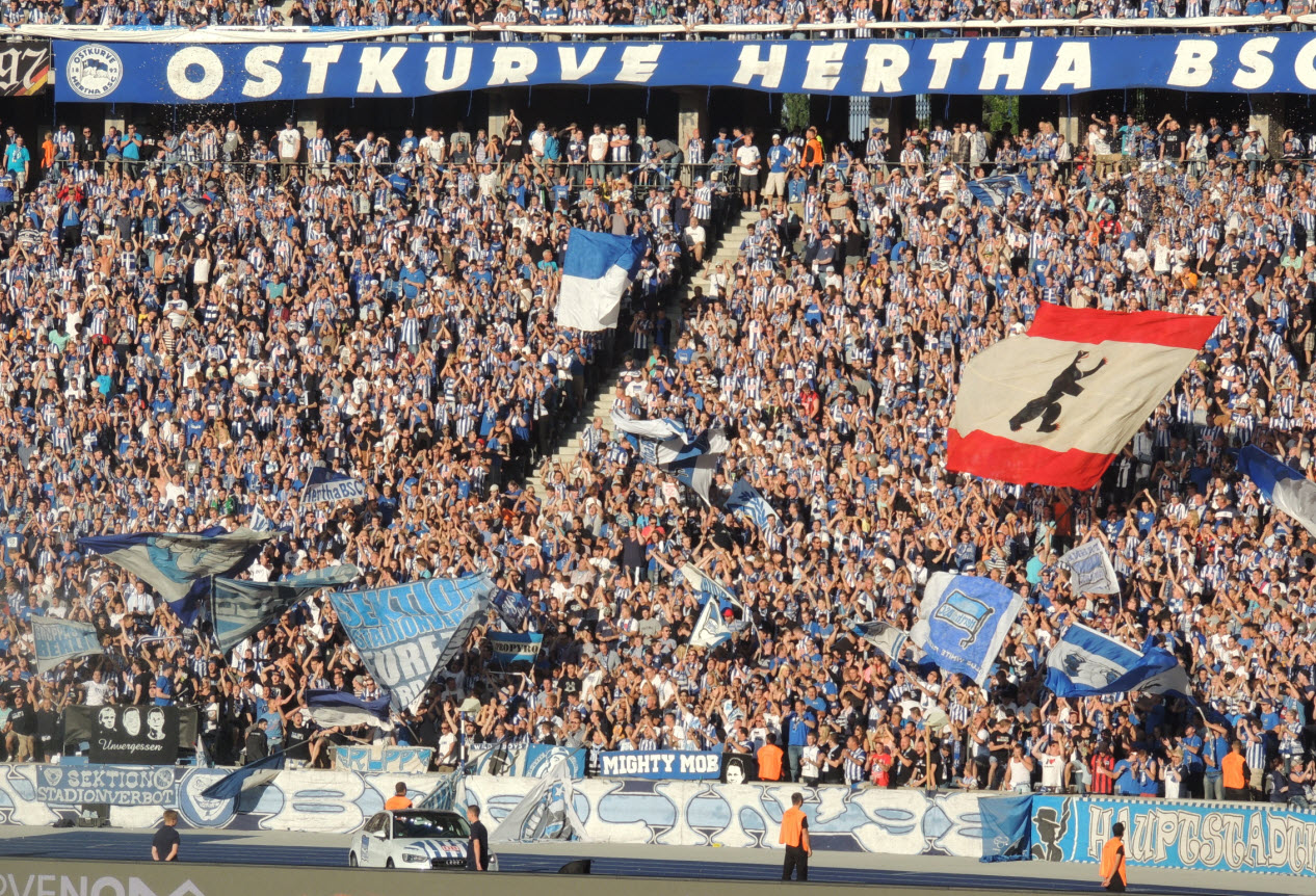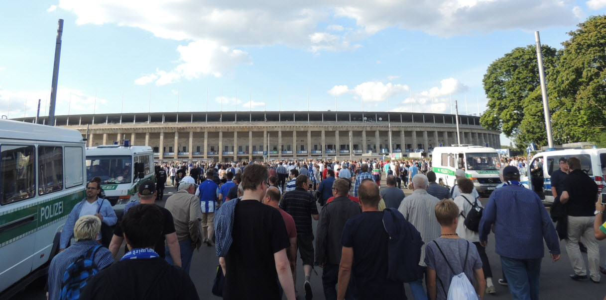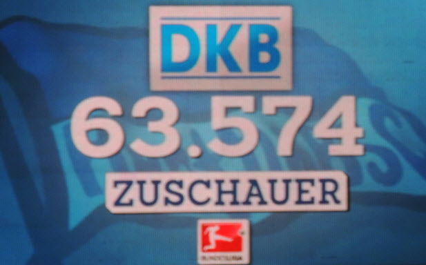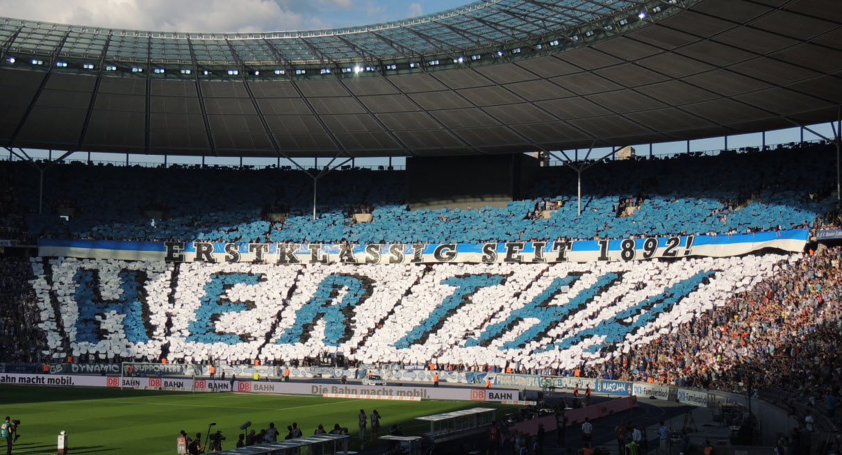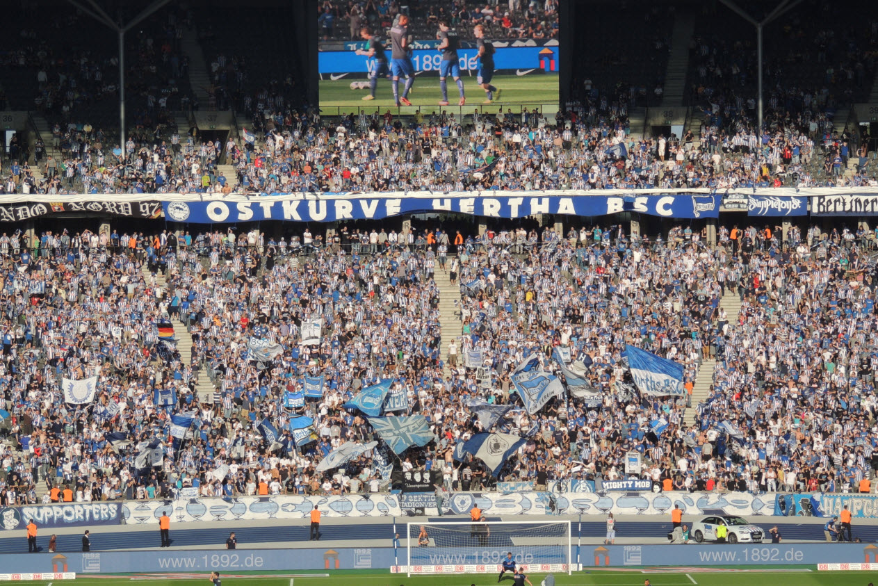 Auch wenn wir natürlich in unserem Volksparkstadion immer noch die besten Fans und die beste Stimmung haben, so muss ich doch zugeben, dass mich kurz vor Spielbeginn die Ostkurve im Olympiastadion mit den zigtausend hüpfenden Fans schon beeindruckt hat. Auch die Größe der Choreo der Ostkurve war nicht schlecht, obwohl wir das natürlich noch größer und besser können !! Der Text der Choreo „Erstklassig seit 1892, Hertha“ war dann jedoch ein Witz, ein schlechter Witz ! |