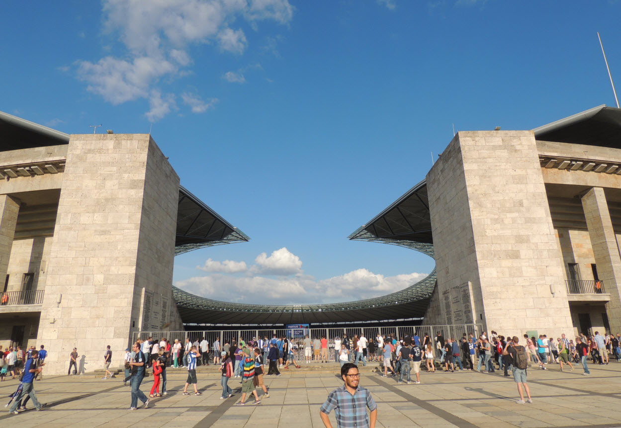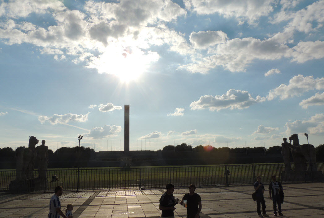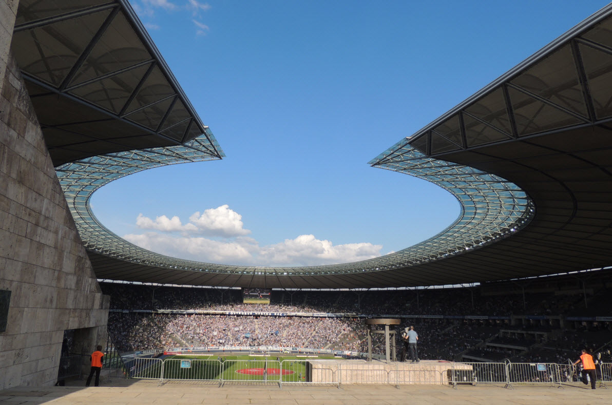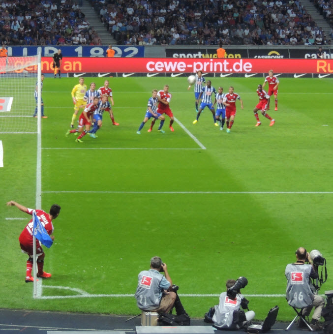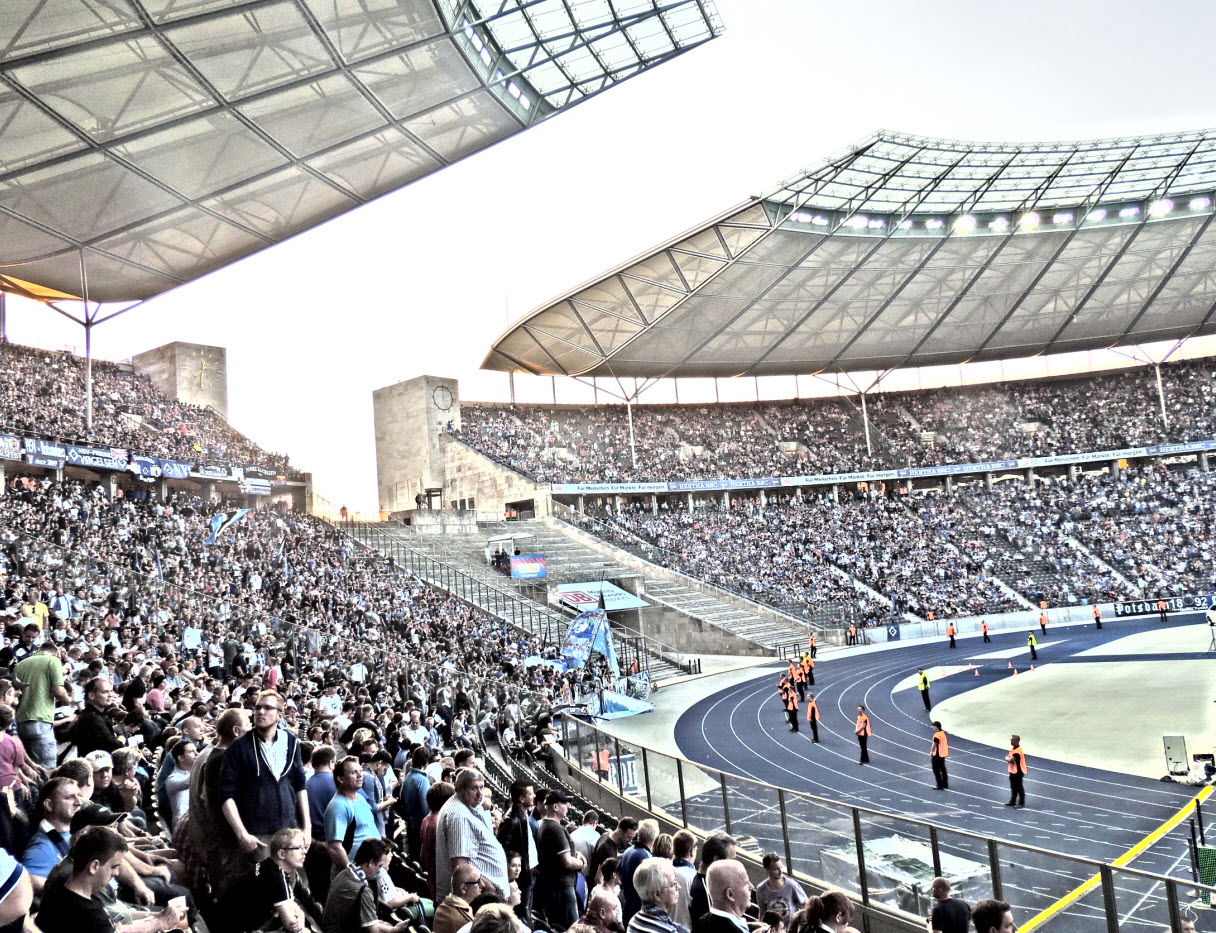 Auch wenn wir natürlich in unserem Volksparkstadion immer noch die besten Fans und die beste Stimmung haben, so muss ich doch zugeben, dass mich kurz vor Spielbeginn die Ostkurve im Olympiastadion mit den zigtausend hüpfenden Fans schon beeindruckt hat. Auch die Größe der Choreo der Ostkurve war nicht schlecht, obwohl wir das natürlich noch größer und besser können !! Der Text der Choreo „Erstklassig seit 1892, Hertha“ war dann jedoch ein Witz, ein schlechter Witz ! |