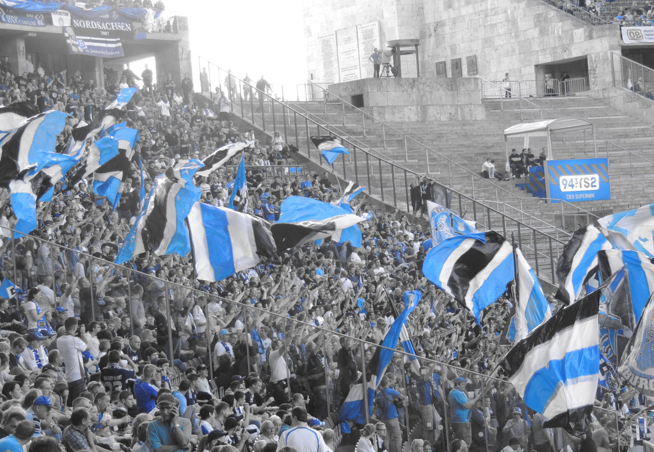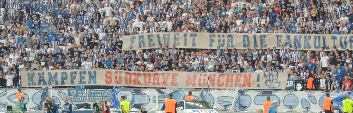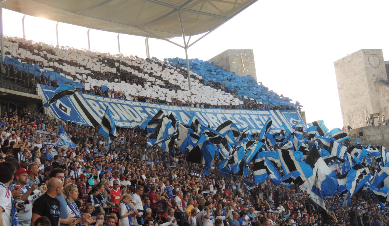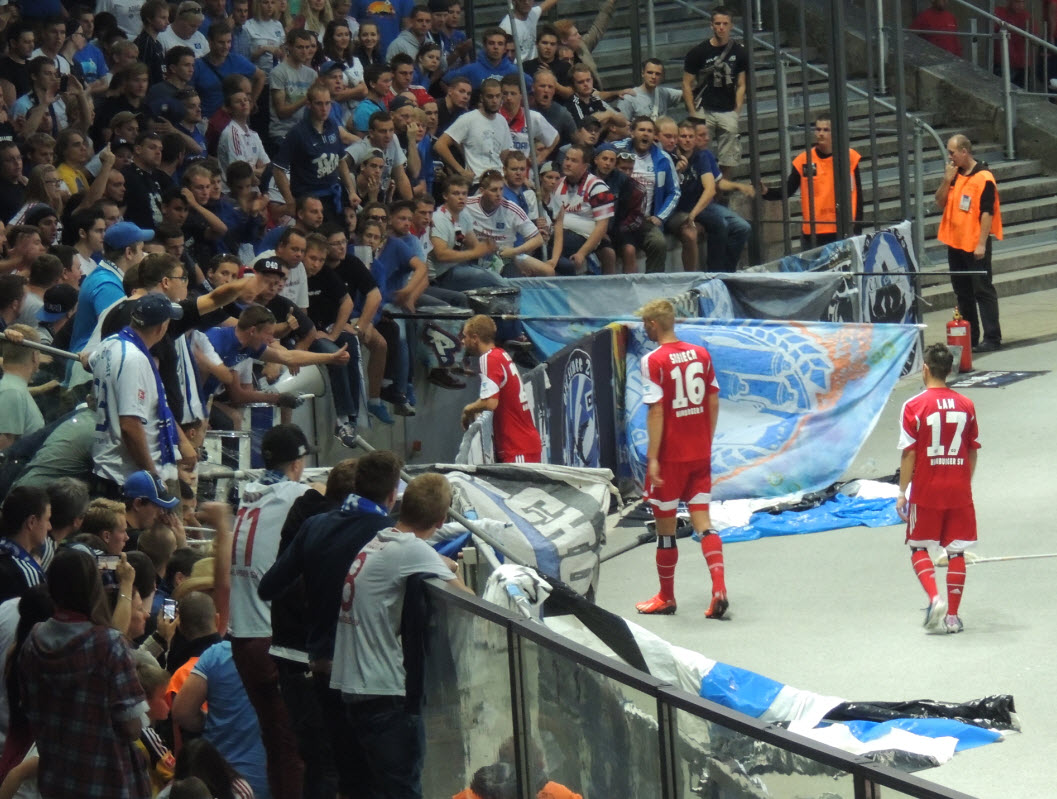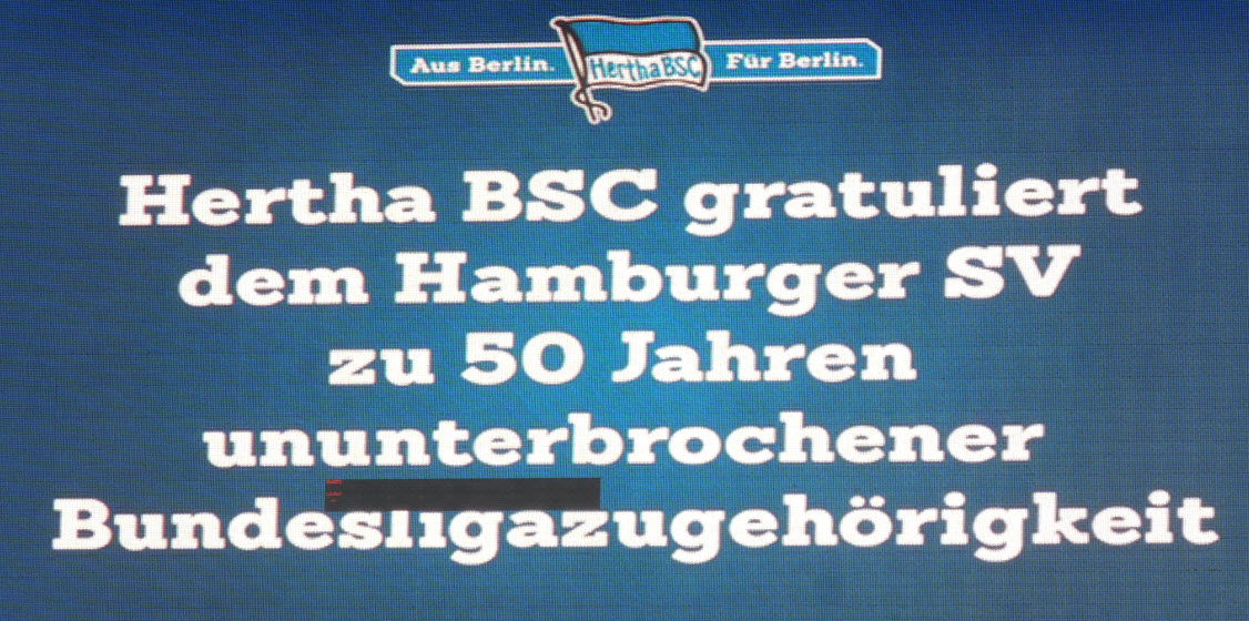 Unsere Choreo war diesmal von der Ausmaßen zwar etwas kleiner, vom Text her dafür umso besser : HSV B U N D E S L I G A U R G E S T E I N ! Hierzu übrigens ein Originaltext aus dem Supporters Newsletter : Hertha BSC hat uns trotz der Vorkommnisse beim letzten Spiel (u.A. Pyrotechnik und Böller) sämtliche Fanutensilien und sogar eine Choreo genehmigt. Wir bitten diesen Vertrauensvorschuß zu respektieren und Euch entsprechend zu verhalten. Später mehr dazu. |