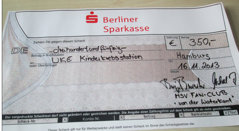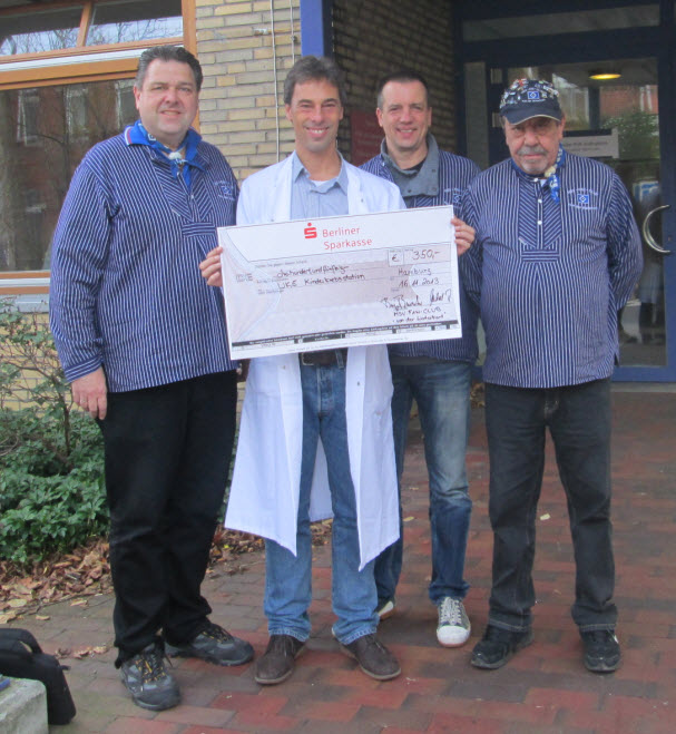 Die meisten betroffenen Kinder mit einer Krebserkrankung sind im Vorschulalter zwischen 3 – 6 Jahre alt. Hier sind die häufigsten Krebserkrankungen Leukämie und Tumore. Insbesondere bei den Tumorerkrankungen sind im Nachgang zu den Operationen spezielle physiotherapeutische Behandlungen erforderlich, die z.Z. in dieser Form von den Krankenkassen noch nicht übernommen werden. Spendengelder werden z.B. hierfür verwandt. Am Ende des Besuches wurde Prof. Rutkowski der obligatorische Scheck übergeben, der sich danach wieder um seine jungen Patienten auf der Station kümmerte. Blau-weiß-schwarze GrüßeBirger P.S. Bevor wir da etwas vergessen. Wir Waterkantler hatten in diesem Jahr noch mehr für den guten Zweck gesammelt und so konnten wir neben der Unterstützung der Kinderkrebsstation im UKE auch noch 350,- € an die DMSG (Deutsche Mulitiple Sklerose Gesellschaft). Leider einer unserer Mitglieder im Fanklub "Von der Waterkant" an Multiple Sklerose erkrankt, deshalb sind wir gerne dem Vorschlag gefolgt auch an die DMSG zu spenden. |