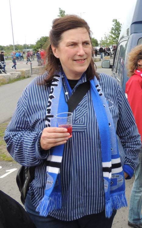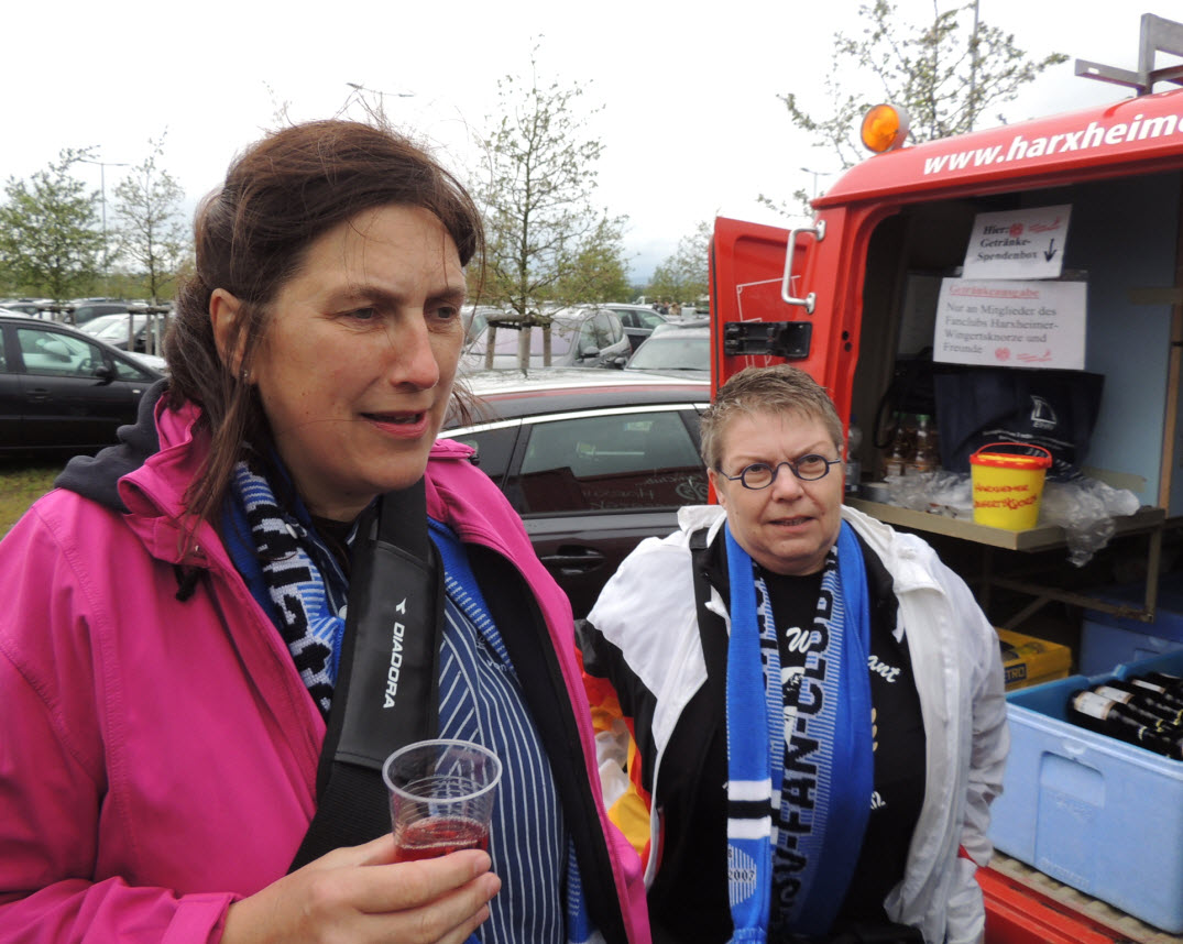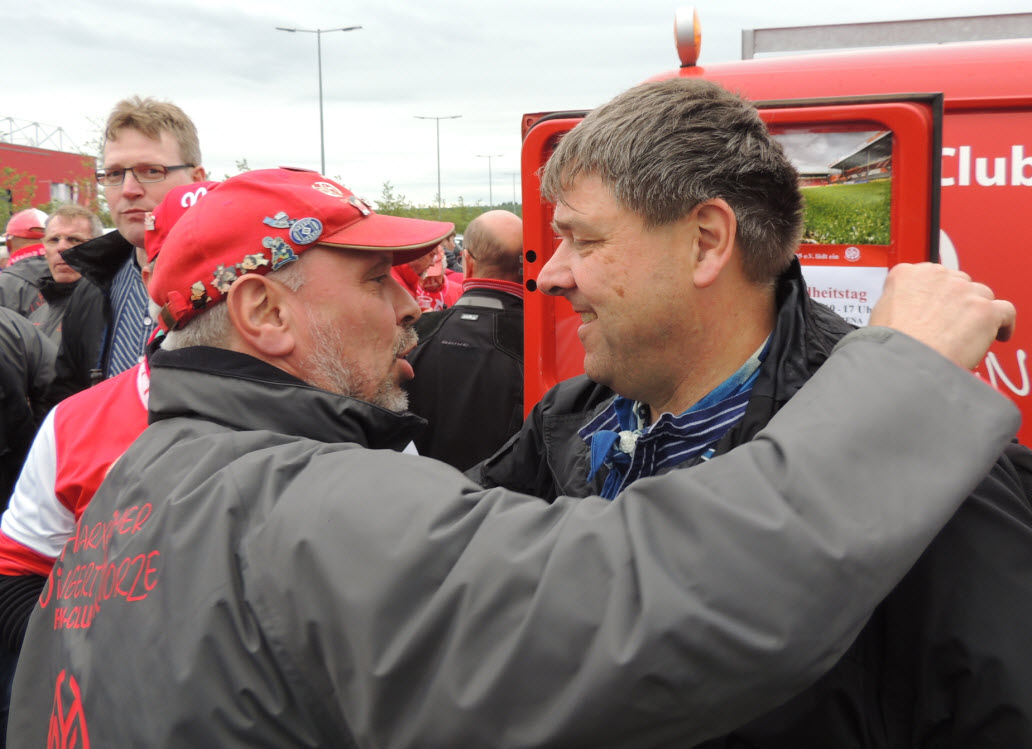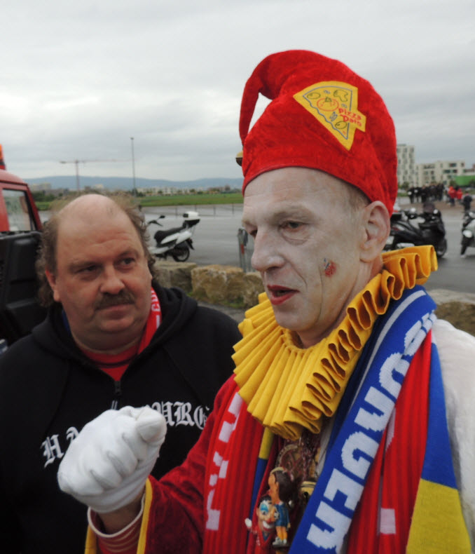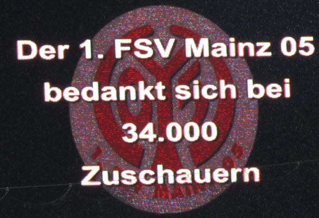 Hier trafen wir unsere Mainzer Freunde vom Fanclub „Harxheimer Wingertsknorze“ am „Feuerwehrauto“, deren „Löschwasser“ veredelt ausgeschenkt wurde. Nach dem Austausch von diversen Nettigkeiten und ganz, ganz wenigen Frotzeleien ging es in die Fan-Kurve. Hier war die Stimmung prächtig, aber trotzdem „musste“ wieder Pyrotechnik gezündet werden, leider.