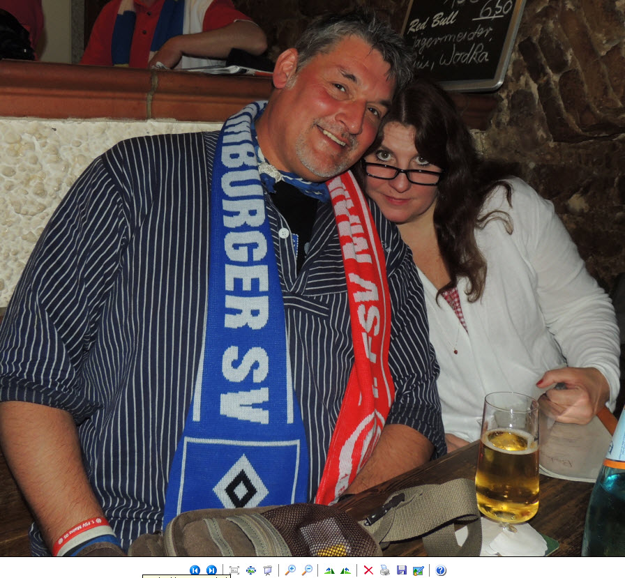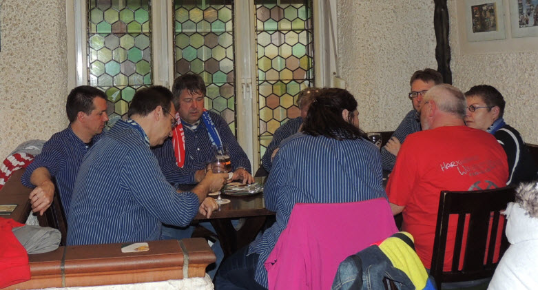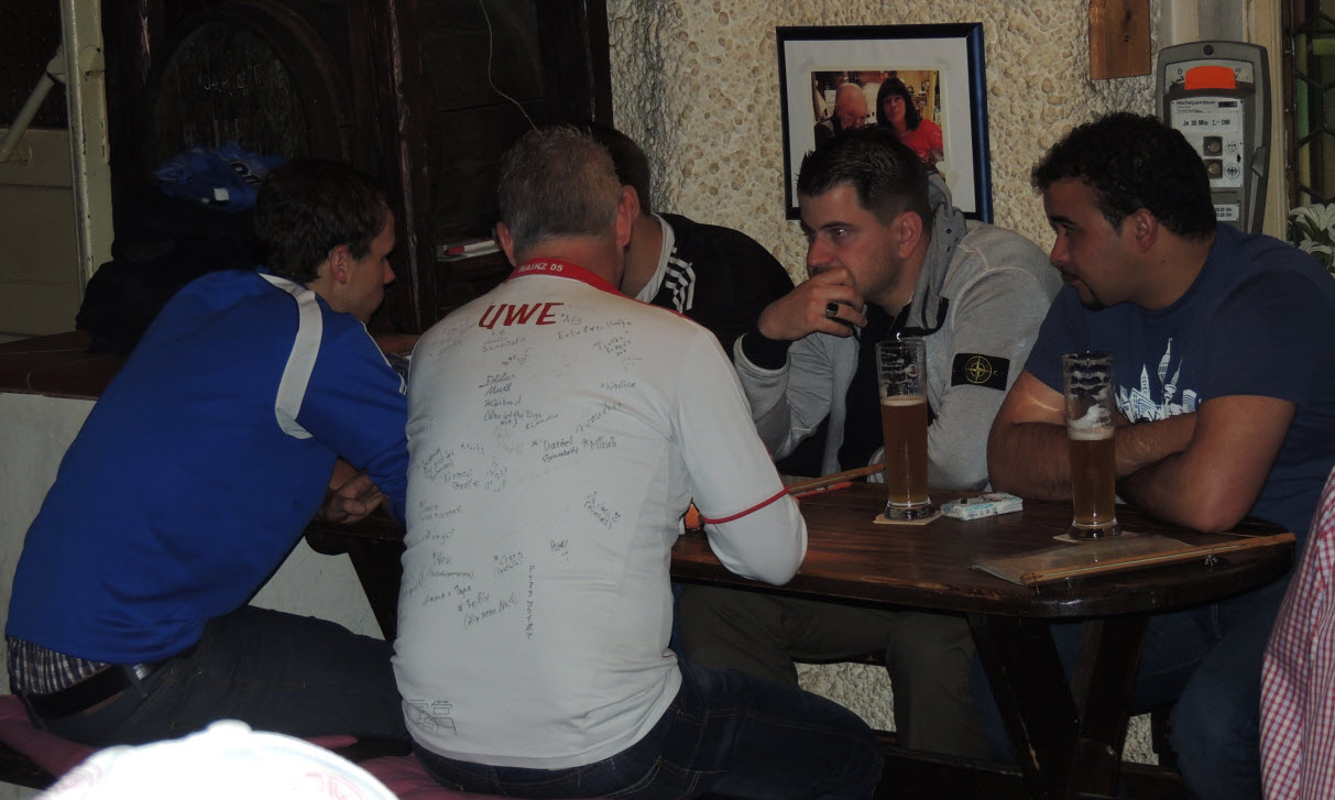 Anschließend ging es im immer höher werdenden Tempo (da hatte mind. 1 ein dringendes …) zum Mainzer Stammlokal des Fanclubs in die Innenstadt. In der gut besuchten „Bodega“ wurde das Warten auf das Essen mit Bier und kleinen Anekdoten (u.a. die Geschichte der geklauten Fanclub-Fahne) überbrückt. Unseren jüngeren Fanclub-Mitgliedern war die Wartezeit zu lang und so zogen sie früher als geplant schon weiter. Zu vorgerückter Stunde ging es dann zurück und vor dem Hotel wurde noch mit anderen HSV-Fans über den vermeintlich besten Relegationsgegner philosophiert.