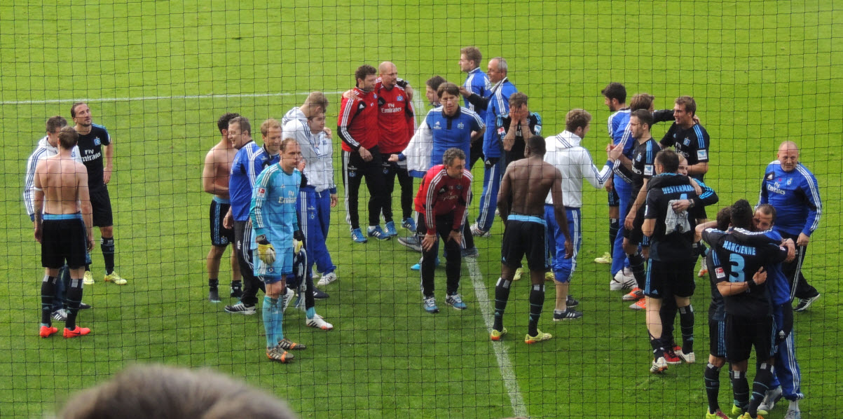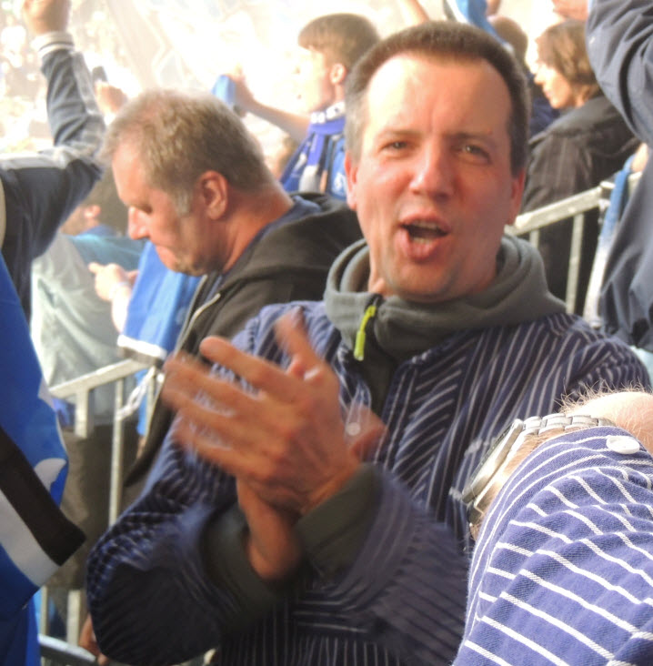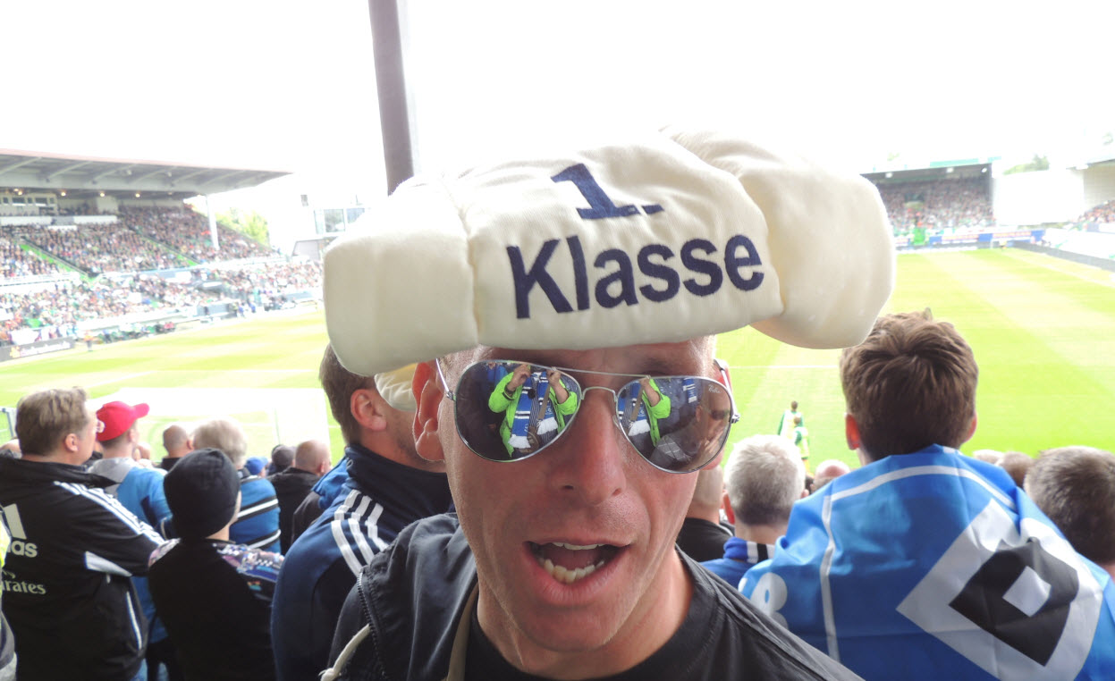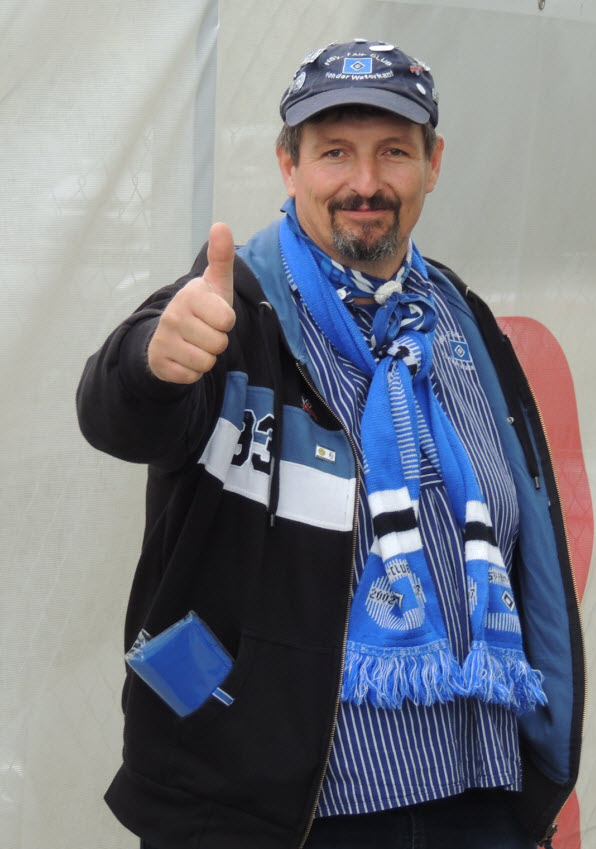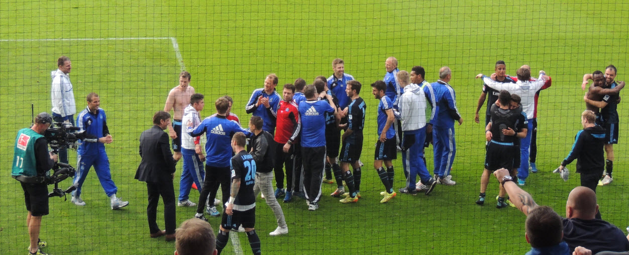 Im zweiten Durchgang lief es erst auch gut und wir waren alle noch entspannt. Dies änderte sich jedoch schlagartig beim Ausgleich. Jetzt fing das Zittern an. Die letzten 10 Minuten waren dann nervlich die Hölle. Drobny stand ca 20 Meter vor uns im Tor und es war ständig Betrieb vor ihn. Zum Glück war er in Topform. Der Schusspfiff war dann eine Erlösung. Wir waren alle fix und fertig. Die Mannschaft kam sofort zum Gästeblock und waren sichtbar genauso erleichtert wie wir. Wir setzten auf unser Lied gleich ein Strophe zu: 6 x Deutscher Meister, 3 x Pokalsieger, 1 x Relegationssieger, immer erste Liga..... |