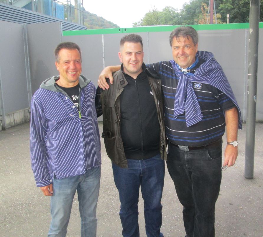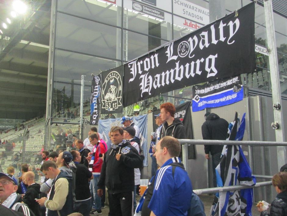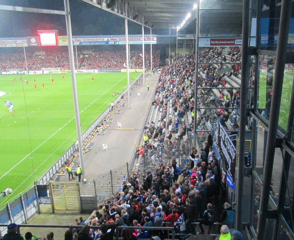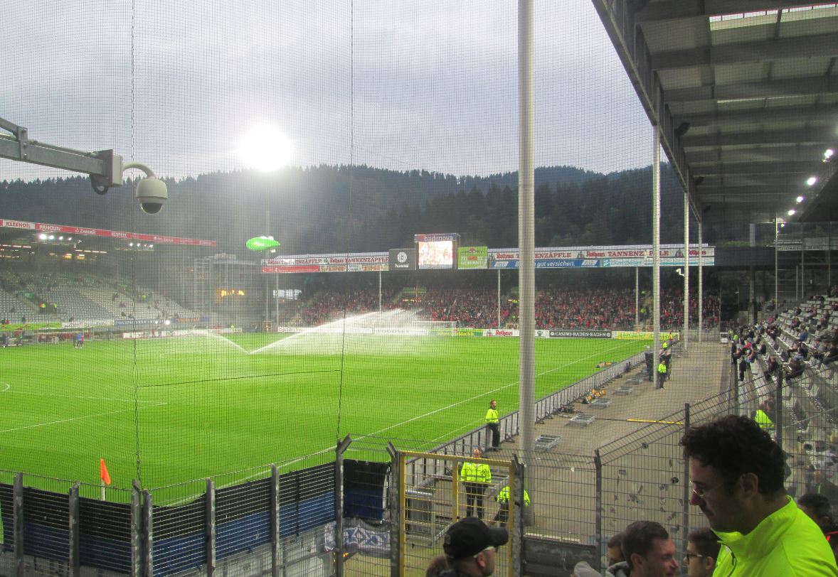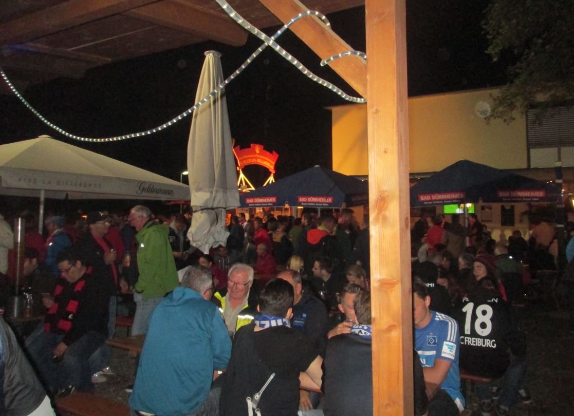 Dann ab zu Fuß ca. 2,5 KM an der Dreisam entlang zum Stadion gewandert, eine einmalige und wunderbare Strecke nach der langen Autofahrt. Ab ins Stadion, und unsere Plätze eingenommen. Aufgrund der hohen Beteiligung im FAN-CLUB hatten wir, wie das Bild belegt, sogar einen ganzen Reihenabschnitt für uns! Spiel, na ja. Warum patzt Adler gerade in diesem Spiel? Warum ist die Mannschaft in den verbleibenden 20 Minuten nicht in der Lage Chancen zu generieren? Wieso bringt die Mannschaft gegen kleinere Vereine immer weniger Fleiß aufs Feld, als gegen die oberen Teams in der Tabelle? Fragen über Fragen, man weiß es nicht. Anschließend bei netter Atmosphäre im Biergarten des Post Sportvereins Freiburg noch ein paar Bier gezischt, und zurück ging zu Fuß entlang der Dreisam via Altstadt zum Hotel. Im