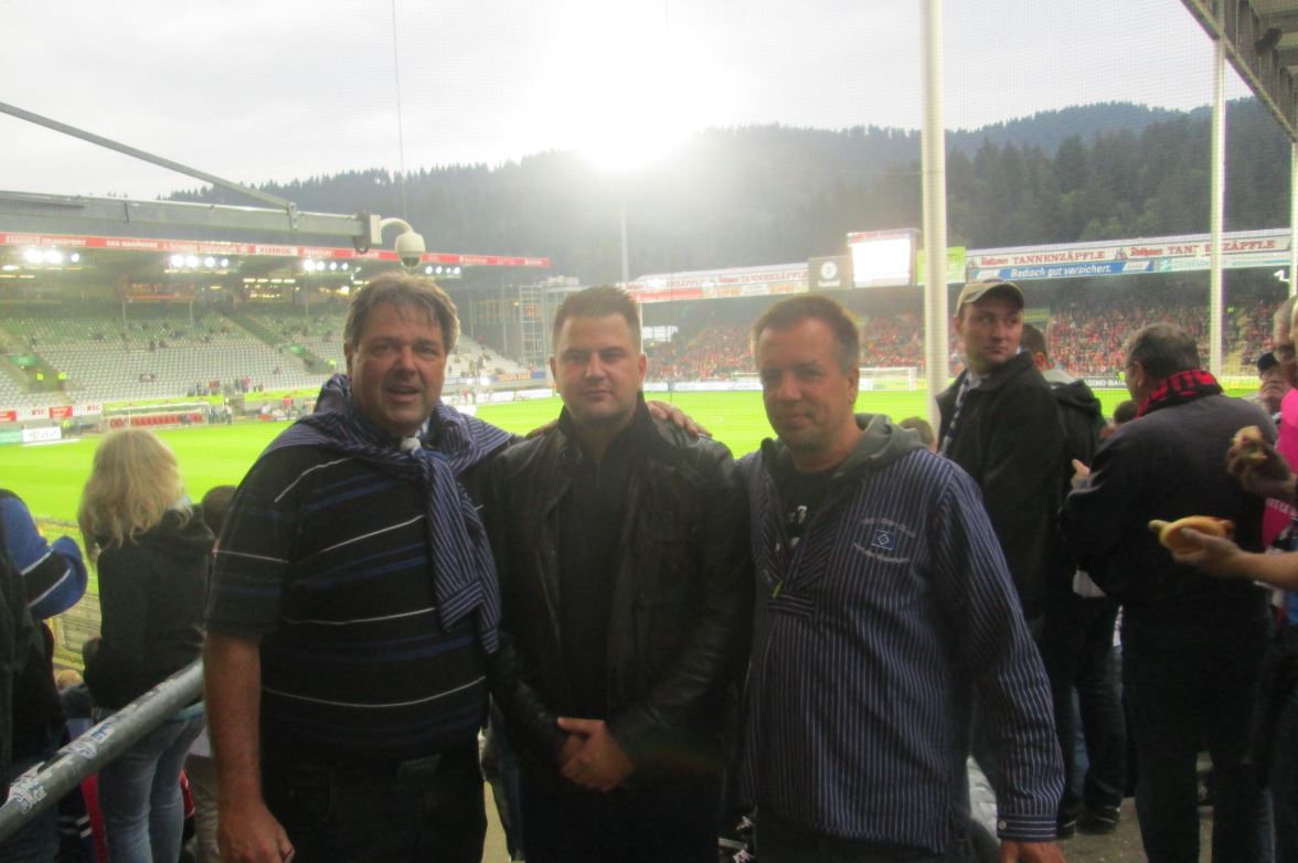 Flugs ging es nach Hannover zum Hauptbahnhof um unseren Finanzvorstand Zigge einzuladen. An einen Fahrerwechsel war nicht im Entferntesten zu denken. Es folgte eine rasante Fahrt durch die Kassler Berge, und selbst nach der Nahrungsaufnahme bei Burger King war eine Veränderung auf dem Fahrersitz nicht möglich. 15:20 Ankunft im Hotel, hier wurden wir freundlichst begrüßt, ach die Herren von der Post aus Hamburg. Nachdem ich nach einem Stadtplan und dem Weg zum Stadion gefragt hieß es: Ach Sie sind wegen des Fußballs in Freiburg – richtig wir sind ja auch nicht von der Post …. Flugs