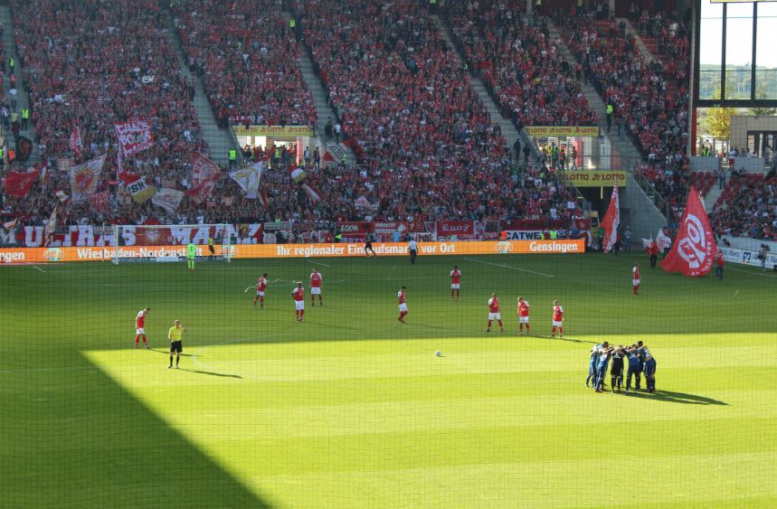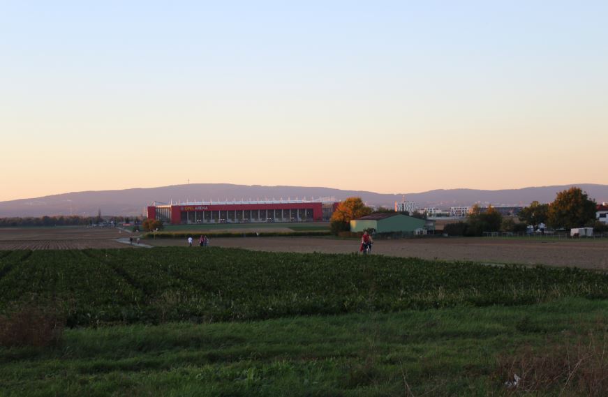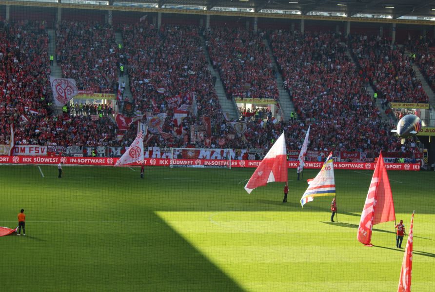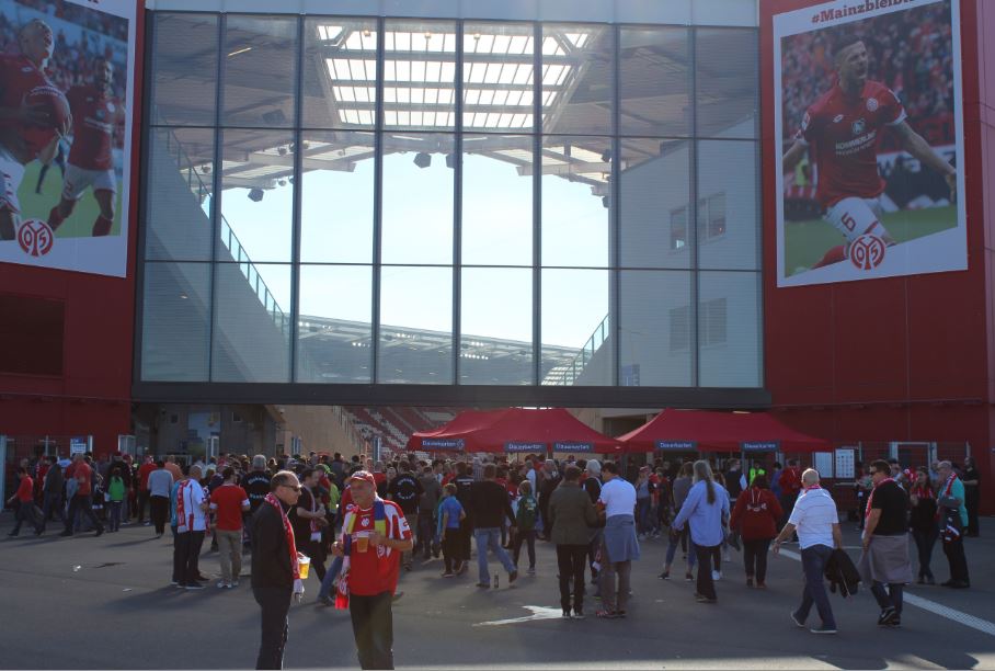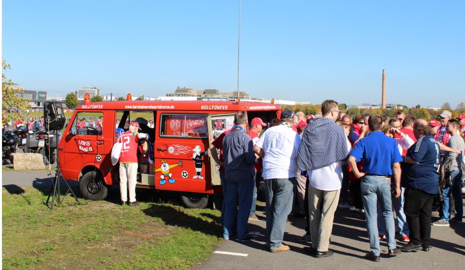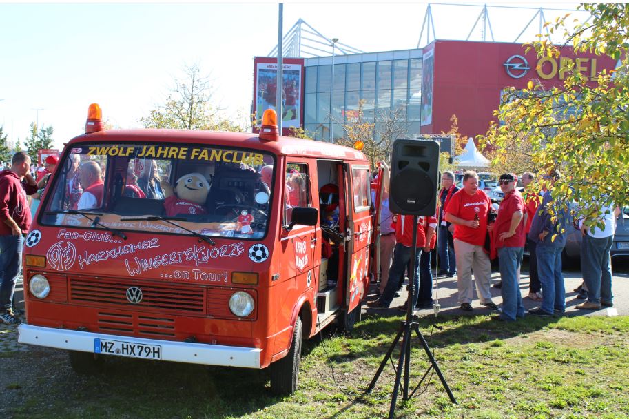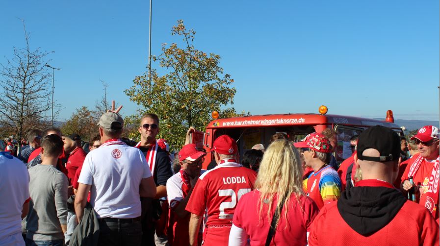 Es ist bereits Mittag und wir steuern auf das Spiel bzw. die Opel-Arena zu. OK, die Anfahrt zur Arena verlief anders als geplant aber wir sind bei blauem Himmel pünktlich angekommen. An einer Burgerbude vorbei gingen wir gestärkt zum Fan-Bus unserer Freunde aus Harxheim. Dort waren bereits ca. 50 Wingertsknörzen bei guter Laune versammelt. Laute Musik, gute Gespräche und eine anhaltende Getränkeversorgung sind bei unseren Freunden Standard. Auch hier wurden wir einfach einbezogen. | |