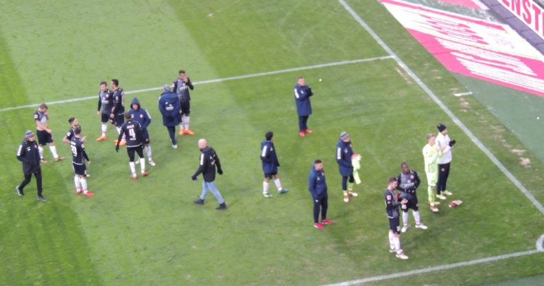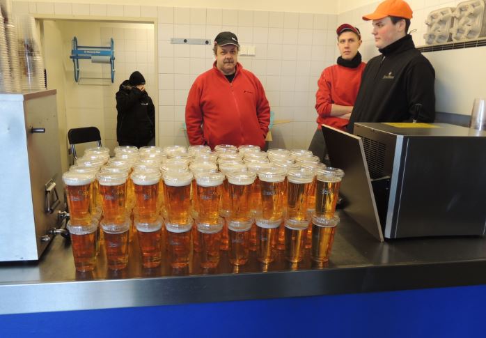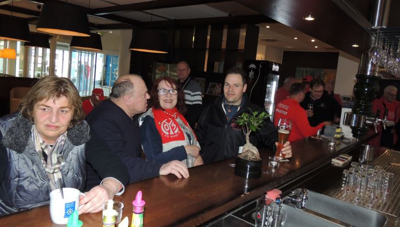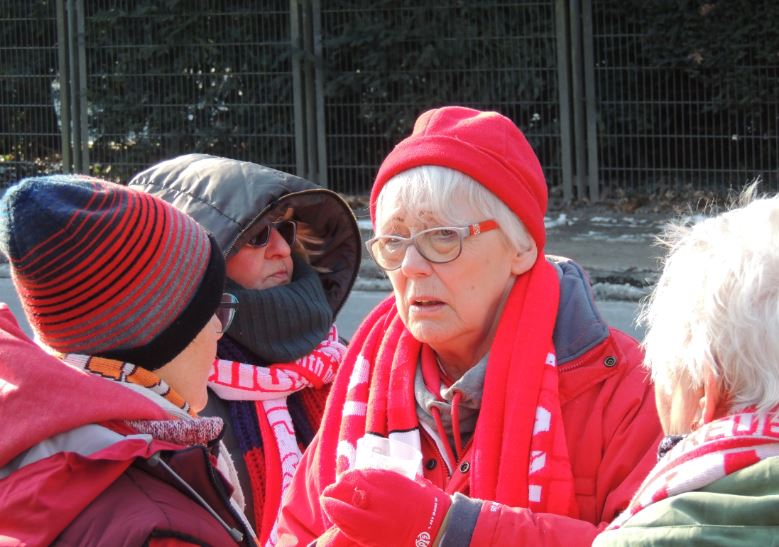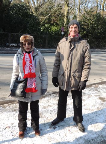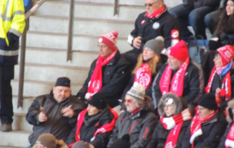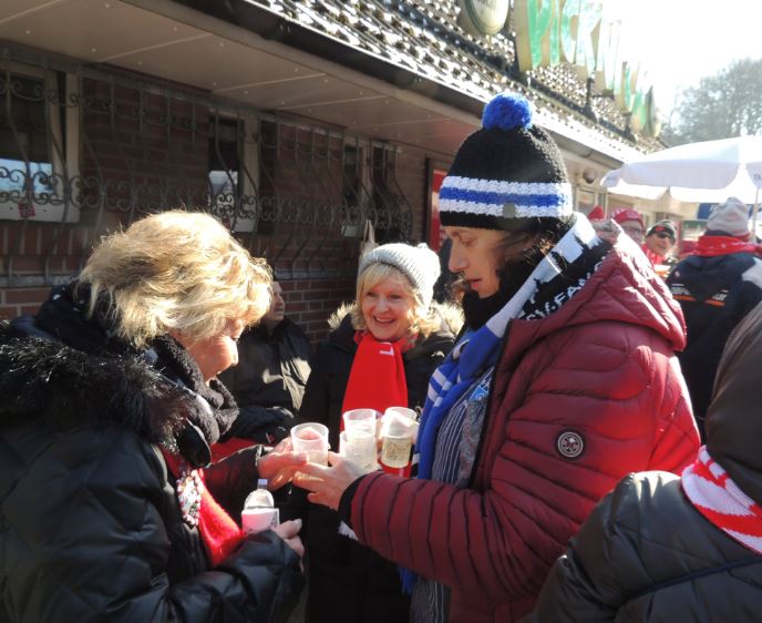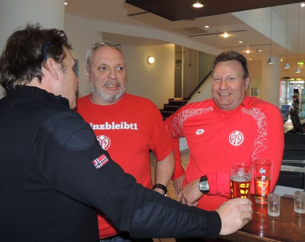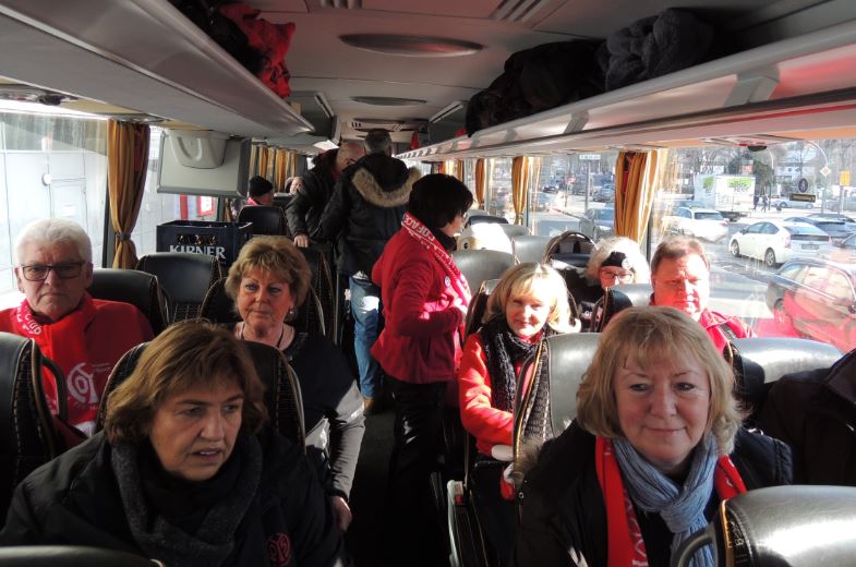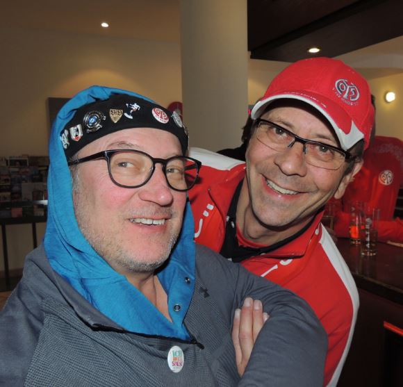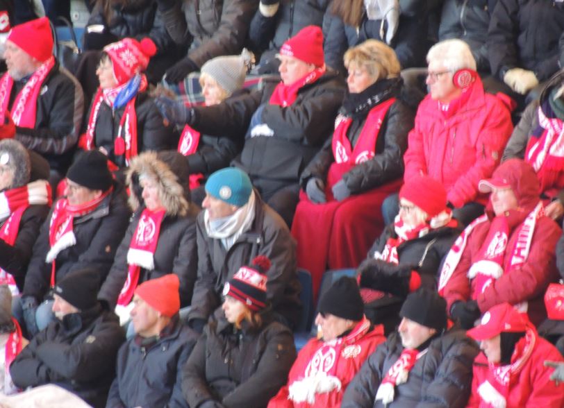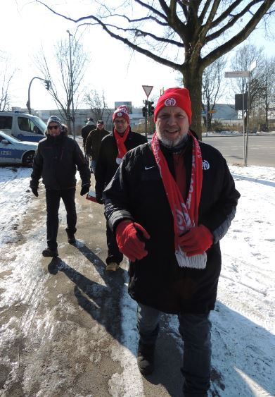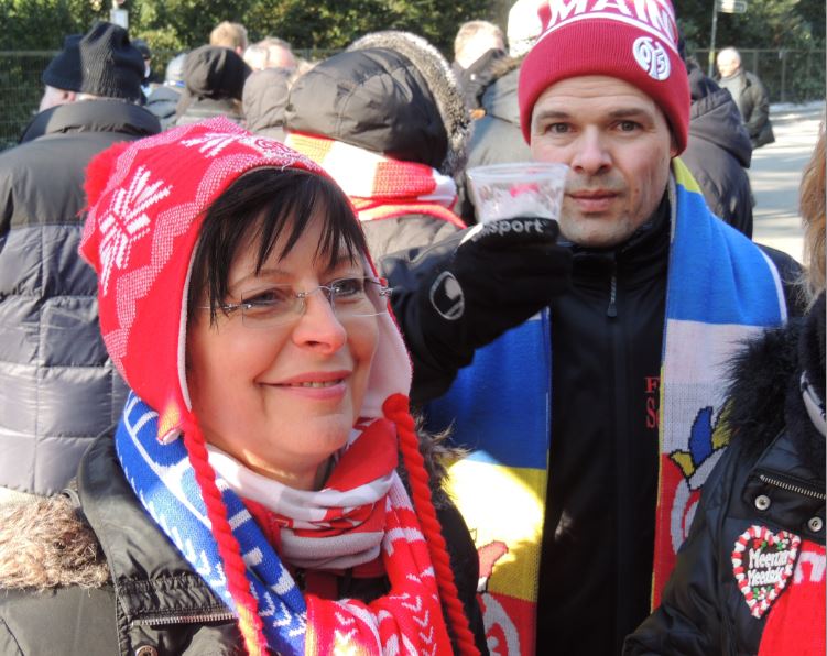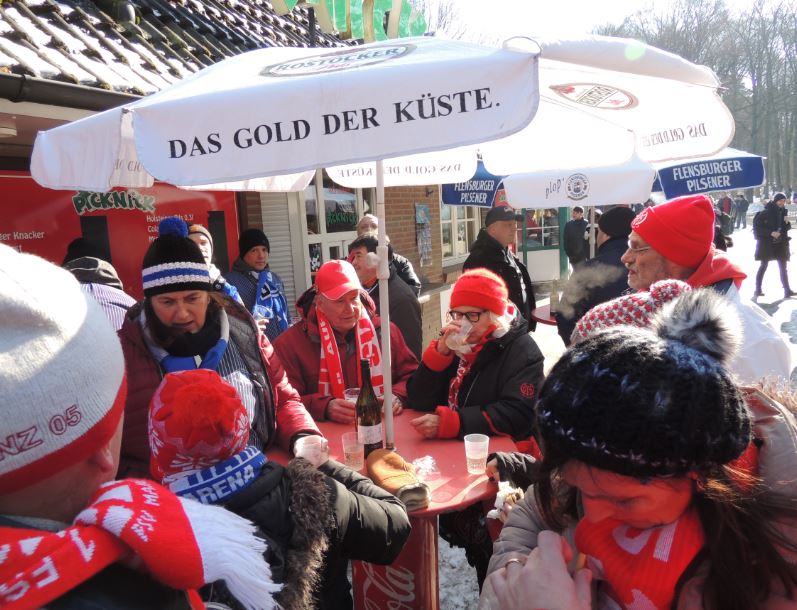 Für den Bus haben wir einen prima Parkplatz direkt beim Mongolen bekommen, bei dem wir nach dem Spiel einkehren wollten. Von dort aus ging es bei herrlichstem Winterwetter zu Fuß zum Picknick, dem Treffpunkt unserer Fanclubs. Die Waterkantler warteten dort schon mit Secco und Bier auf die Freunde aus Meenz. |