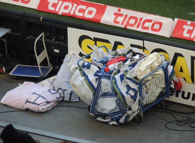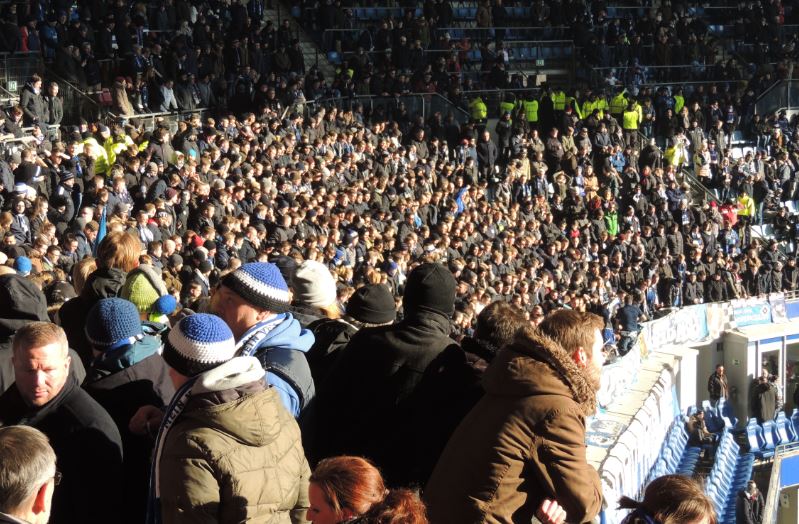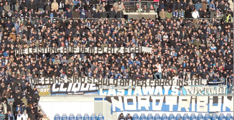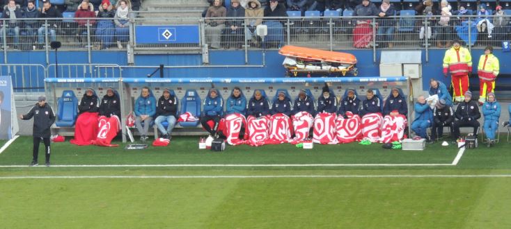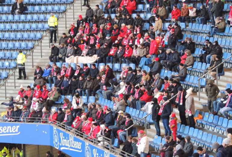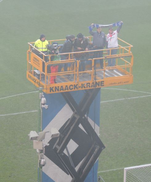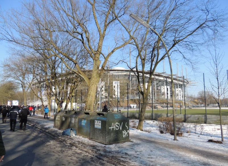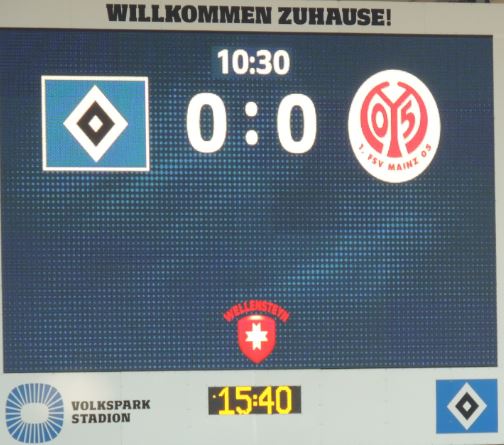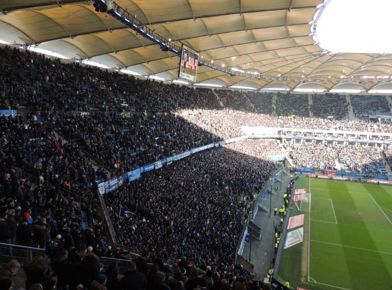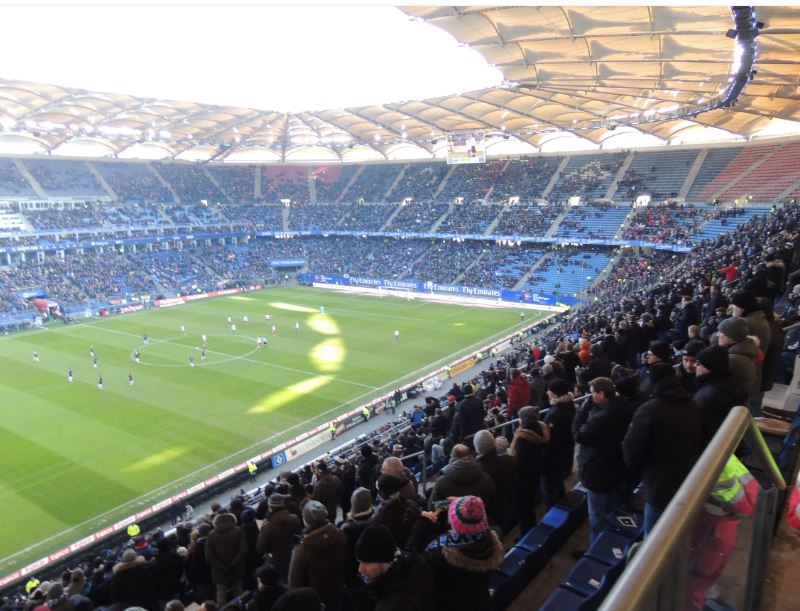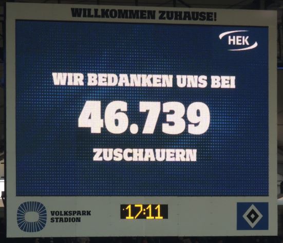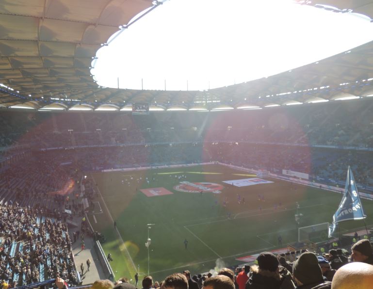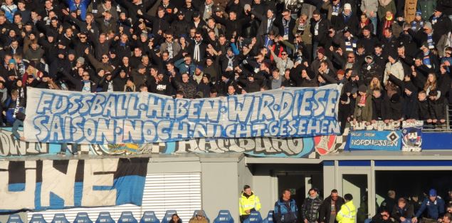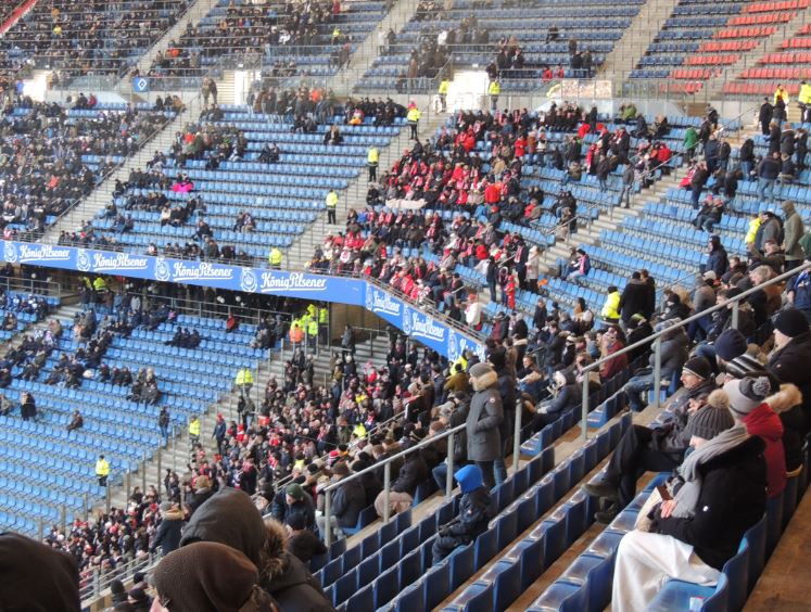 Dann ging es zum Volksparkstadion. Strikte Fantrennung! Die Angst ging um, dass sich die in letzter Zeit ständig "danebenbehemenden" (eigentlich viel zu positiv ausgedrückt!) Hamburger Fans - also nur die kleine Gruppe der Ultras - Ärger machen würden. Es hatte auch zur Folge, dass intensiver die Eingangskontrolle durchgeführt wurden, was zu der absoluten Lächerlichkeit führte, dass die Ordner einfache Leinbeutel, in denen Schals, Handschuhe, Decken oder Sitzkissen mit in Stadion genommen werden sollten, nicht akzeptierten, da diese ja über der vorgeschriebenen DIN A4 Größe für Taschen angesiedelt seien.