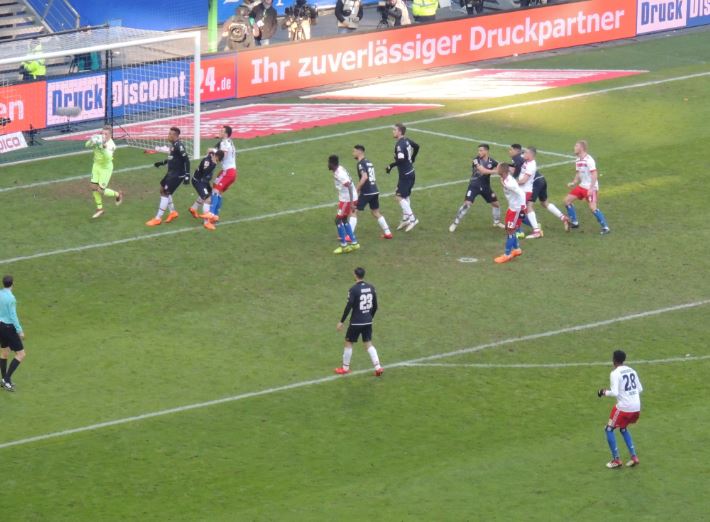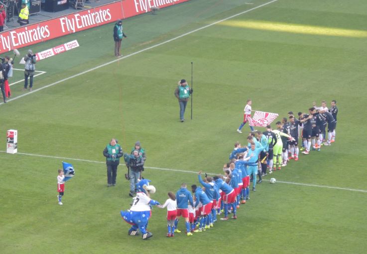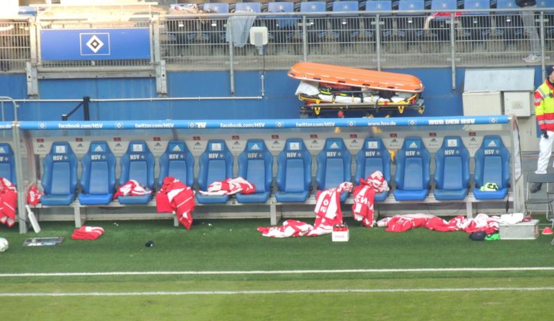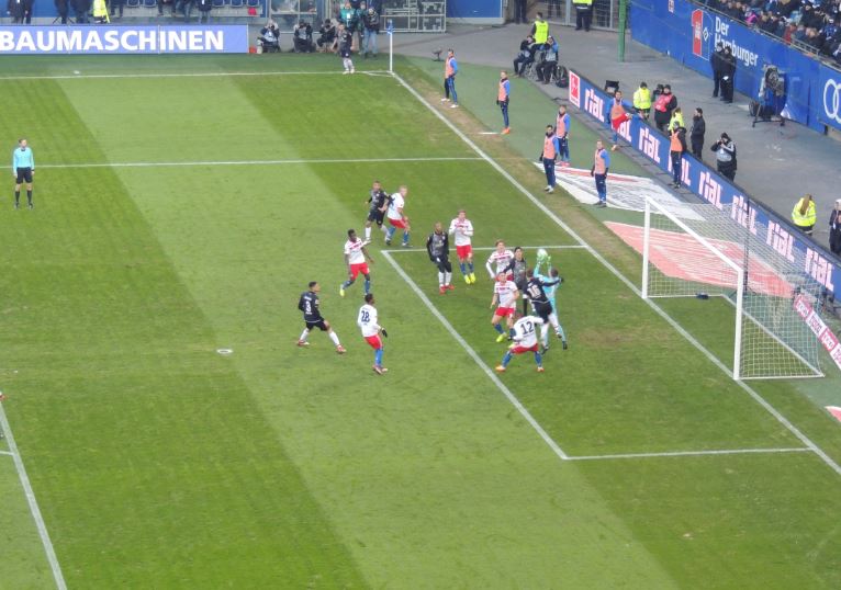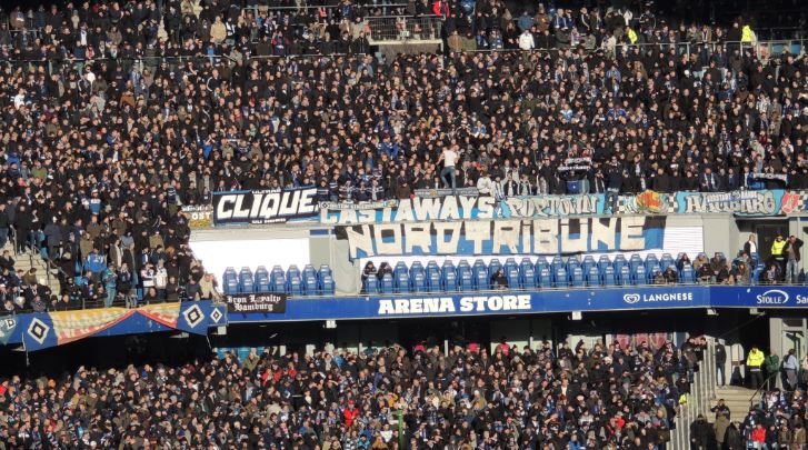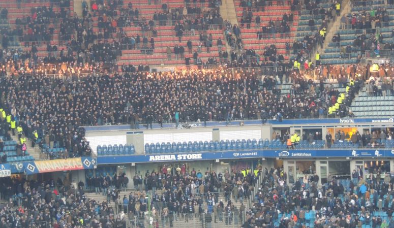 Für uns Waterkantler hatte das Spiel noch eine sehr unerfreuliche Überraschung parat. Wir durften nicht auf unseren angestammten Plätzen das Spiel verfolgen, da sich dort in den Blöcken im B-Rang der Nordkurve die selbsternannten besten Fans des HSV breit gemacht. hatten. Ordner und Polizei konnten (und wollten!) nichts gegen diesen überraschenden Blocksturm unternehmen. Die durchweg schwarzgekleideten wollten mit dieser Aktion dagegen protestieren, dass unter der Woche aus Sicherheitsgründen die Zäune im A-Rang erhöht worden sind. Kein Wunder, so zeichnet sich diese Gruppe auch für den versuchten Platzsturm bei der Heinniederlage gegen Leverkusen und für das spielbegleitende Feuerwerk beim letzten Auswärtsspiel in Bremen verantwortlich. Ich