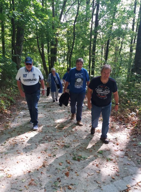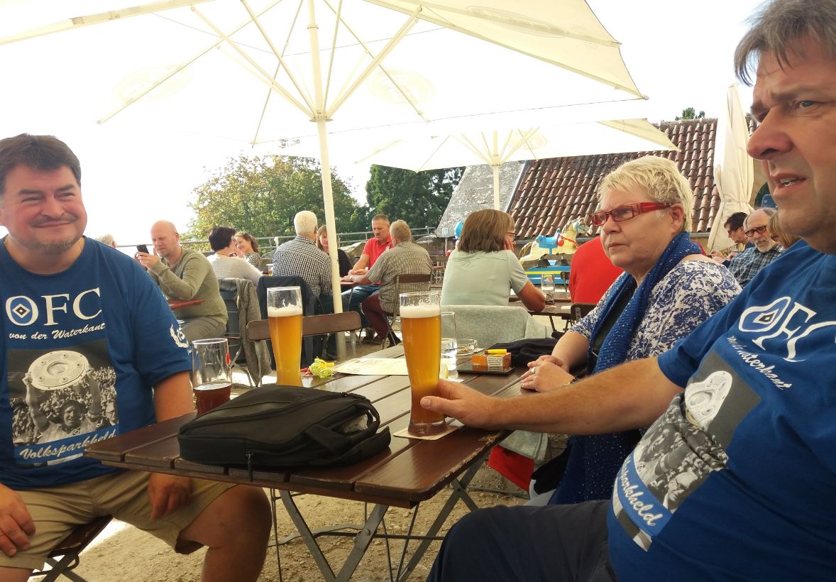 Wieder zurück in Mürsbach kehrten wir im Biergarten ein und „kauften“ uns am Stammtisch ein und plauderten u.a. mit dem 2. Bürgermeister der Gemeinde über dit und dat. Leider war der Nachmittag nicht mehr so sonnig, eher stürmisch, so dass wir unsere Zelte in der Gaststube aufschlugen. Hier verlebten wir bei großen und kleinen Getränken einen unterhaltsamen Abend. Winnie, ein Freund des Fanclubs, kam auch vorbei und sorgte mit allerlei Geschichten für gute Stimmung. Als Beispiel sei hier sein „Getränkeunfall“ genannt, der bei ihn für eine gewisse Zeit zur Enthaltsamkeit führte (was für eine schöne Umschreibung). Der Abend bzw. die Nacht endete wie gewohnt im Wohnzimmer. Das Alter zerrt an unseren Körper, so dass wir nicht mehr vollzählig beim Schlaftrunk waren. Nach einem reichhaltigen Frühstück war die schöne Zeit vorbei und wir verließen Mürsbach wieder in alle Richtungen. Was bleibt von dieser Auswärtsfahrt