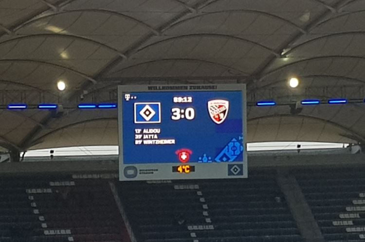 Im Stadion war dann ausreichend Platz und wir nahmen auf unseren angestammten Sitzen im Block 28B Reihe 13 Platz. Die ersten 15 Minuten verliefen prächtig und nach 13 Minuten konnten wir durch unseren neuen Wunderstürmer Alidou mit 1:0 in Führung gehen. Ob man ihn im nächsten Sommer bei auslaufendem Vertrag so wird halten können ?? Im Anschluss verflachte die Partie und es plätscherte so dahin. Ingolstadt hatte sich am Anfang, wie eine Bubbimannschaft auf Manndeckung eingeschworen, gab diese aber nach dem Rückstand weitestgehend auf. Kurz vor der Pause meinte ich, es wäre doch prima, wenn der HSV noch ein Tor nachlegen würde. Als hätten Sie es gehört, köpfte Jatta in der 40.Minute das 2:0. Die zweite Halbzeit war lange nicht wirklich zum Ansehen geeignet und wir fingen ordentlich an zu frieren. Ingolstadt kam nun tatsächlich etwas stärker auf. Aber nur, weil die HSV-Abwehr und insbesondere auch unser Torwart den gegnerischen Stürmern so einiges ermöglichten, was an sich nicht Not getan hätte. In den letzten 20 Minuten orientierte man sich wieder mehr nach vorn und es ergaben sich drei riesige Chancen. Erst ballerte Alidou rechts am leeren Tor vorbei, dann hatte Heyer eine ähnlich klare Chance. Am Ende zielte noch Meißner einen Kopfball knapp am Pfosten vorbei. Unglaublich, wie man diese hundertprozentigen Chancen alle liegen lassen kann. Zum Glück rächte sich das dieses Mal nicht. In der 89.Minute hatte der eingewechselte Wintzheimer ein Einsehen mit uns und erzielte das 3:0 zum Endstand. Wir waren glücklich und konnten uns auf unseren Fußwegen zu unseren Autos wieder warmlaufen. Mal sehen wann es wieder möglich ist mit mehreren FanClub-Mitgliedern einen Sieg zu feiern. Schön wäre es in jedem Fall.