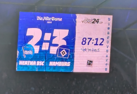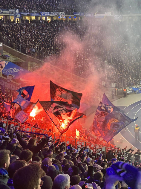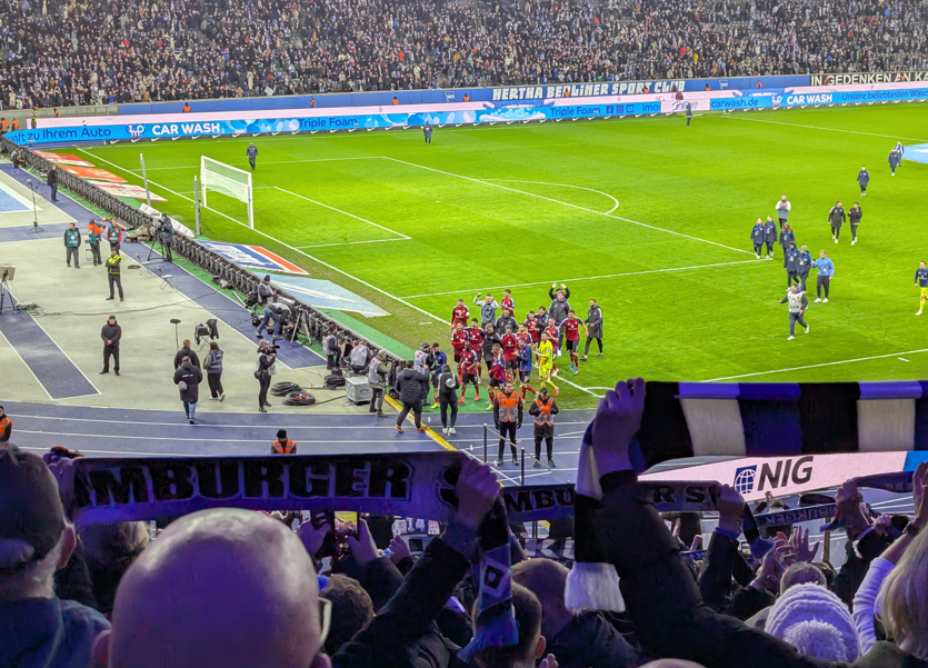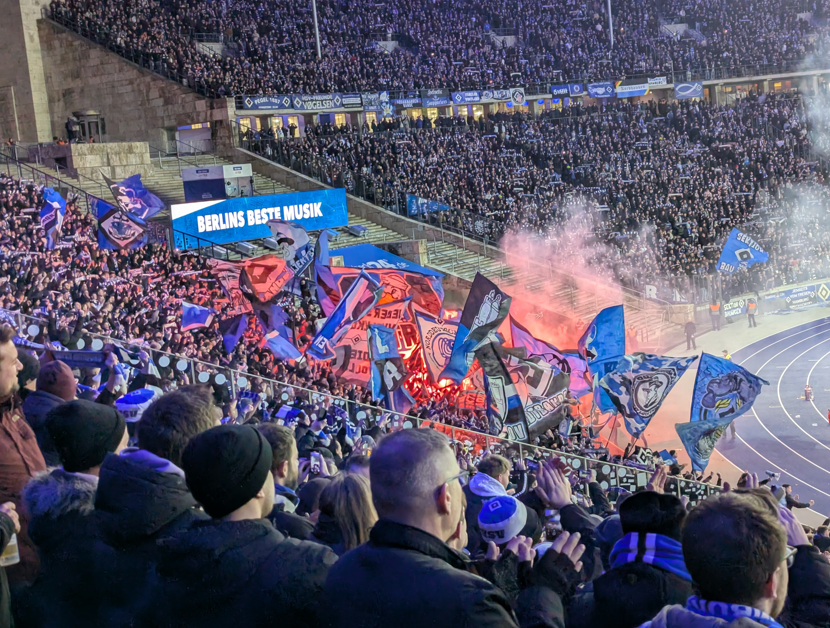 Starker Auswärtssieg bei der „Alten Dame“ im ausverkauften Berliner Olympiastadion, darunter sagenhafte 20.000 HSV-Fans !!! Am Samstagnachmittag trafen sich Harald, Stephan und der Berliner Jung im „Preußischen Landwirtshaus“ direkt am Stadion. Hier am traditionellen Treffpunkt der Hertha- aber auch Auswärtsfans herrschte früh eine tolle Stimmung. Die Stimmbänder wurden mit Gerstensaft geölt, so dass die Sangeskünste beider Fan Lager den Biergarten beschallte. Frühzeitig machten wir uns dann auf dem Weg ins Stadion und schwupp di wupp waren wir drinnen und genossen erst einmal eine Berliner Currywurst. |