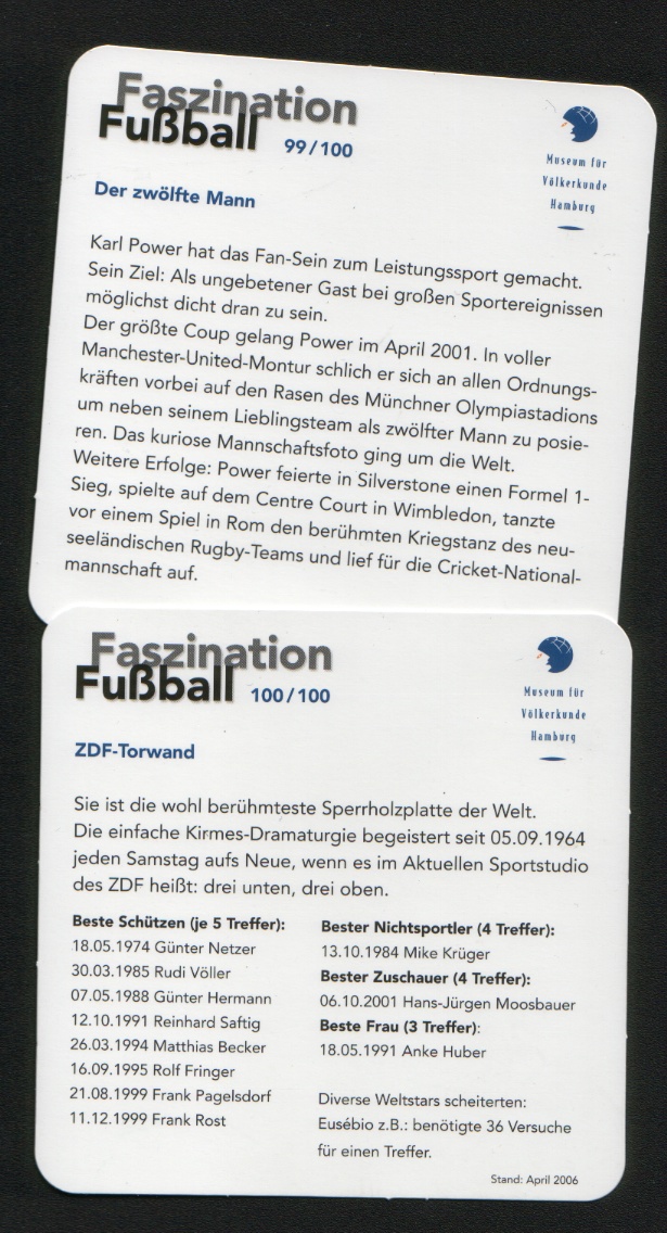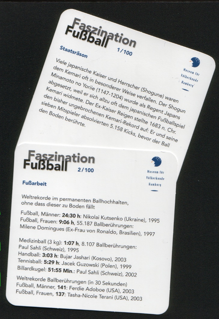 Auf etwa 1.000 m², verteilt auf vier Säle, erstreckt sich die Fußballausstellung des Museums für Völkerkunde Hamburg. Kernpunkt der Ausstellung sind die Fragen: Warum hat sich der Fußball zu einem derartigen sportlichen Erfolgsmodell entwickelt und was macht die ungeheure Faszination dieses Sportes aus. Um diese Fragen zu beantworten hat sich unser Team auf den Weg gemacht und weltweit nach Antworten gesucht. | |