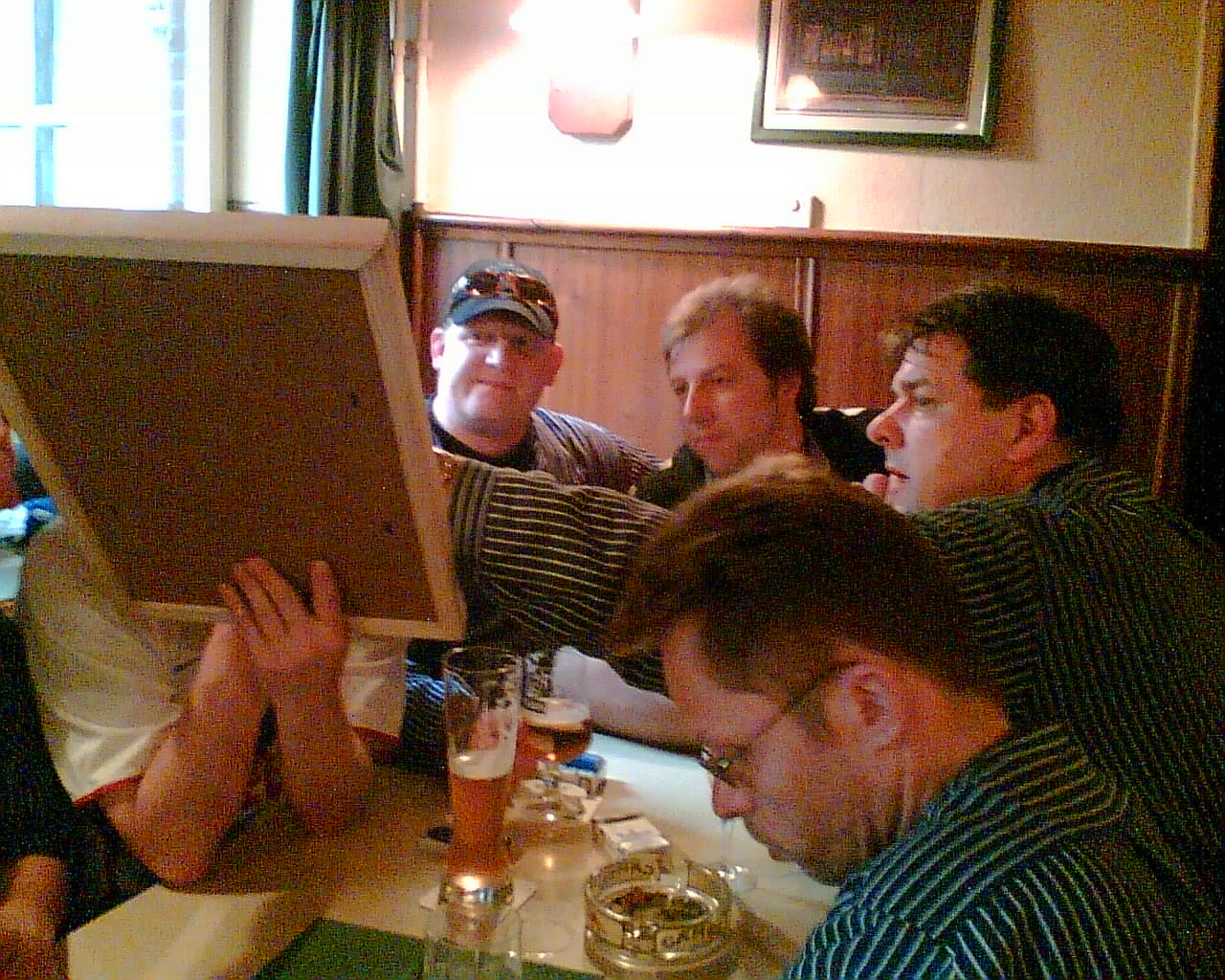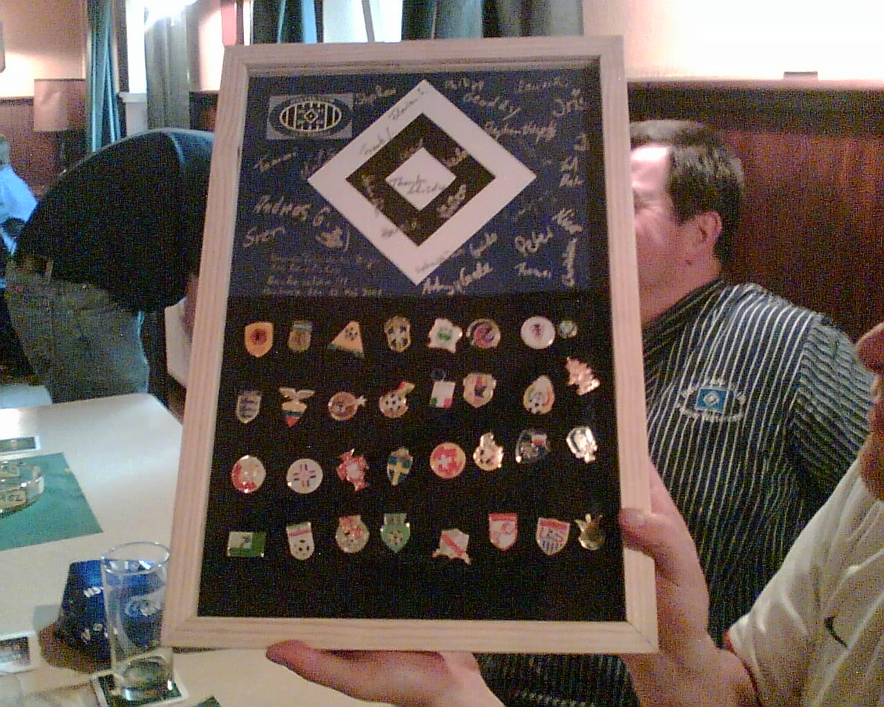 Stephan hatte die sehr gute Idee unseren ElPresidente mit einer Pinsammlung zu überraschen und ihm damit für seine unermüdlichen Dienste um unsren Fanclub zu gratulieren. Das einzige Problem, wo wird er noch ein geeignetes Plätzchen finden, um seine neuen Pins aufzuhängen? | |