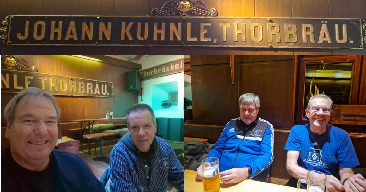 Der Rückweg ging reibungslos. Es war gut organisiert. An der Straßenbahn stand an den Türen einer der für ein bisschen Ordnung sorgte. Die Bahnen standen immer bereit, eine fuhr ab, schon war die nächste Bahn da. Bis zum Königsplatz und dann ein paar hundert Meter bis zum Brauhaus Thor zum Essen und Abschlussgespräch. Dort wurde es schnell voll von HSV-Fans und dementsprechend laut. Das Essen und Bier wieder sehr gut. Reiner hat, mit vielen Fotos, uns noch von dem Baufortschritt seines Hauses berichtet. Das war sehr interessant. Gegen 22.00 Uhr sind wir in Richtung Hotel gegangen und wollten Reiner noch zur Straßenbahn bringen, aber Reiner wollte lieber zu Fuß zum Hauptbahnhof laufen. Also verabschiedeten wir ihn und gingen zum legendären Abschluss mit Absacker aufs Hotelzimmer.
