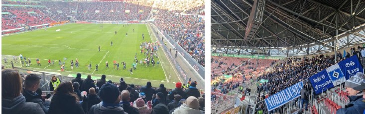Unsere Plätze sehr gut, man konnte sehr gut gucken. Hinter uns drei Rothosen und gleich ins Gespräch gekommen. Als Begrüßung der HSV-Fans hat der FCA als erstes „Hamburg meine Perle“ gespielt und die Meisten haben mitgesungen, ein gelungener Anfang. Als die Kinder mit